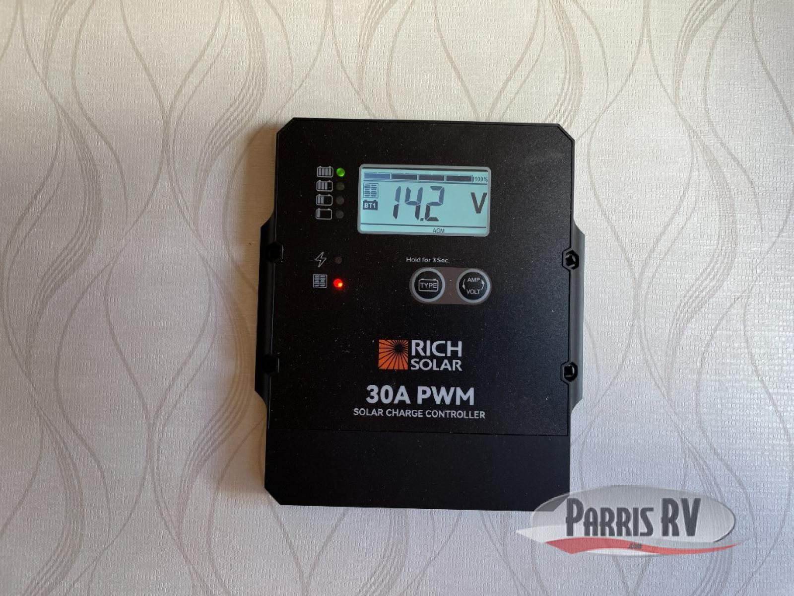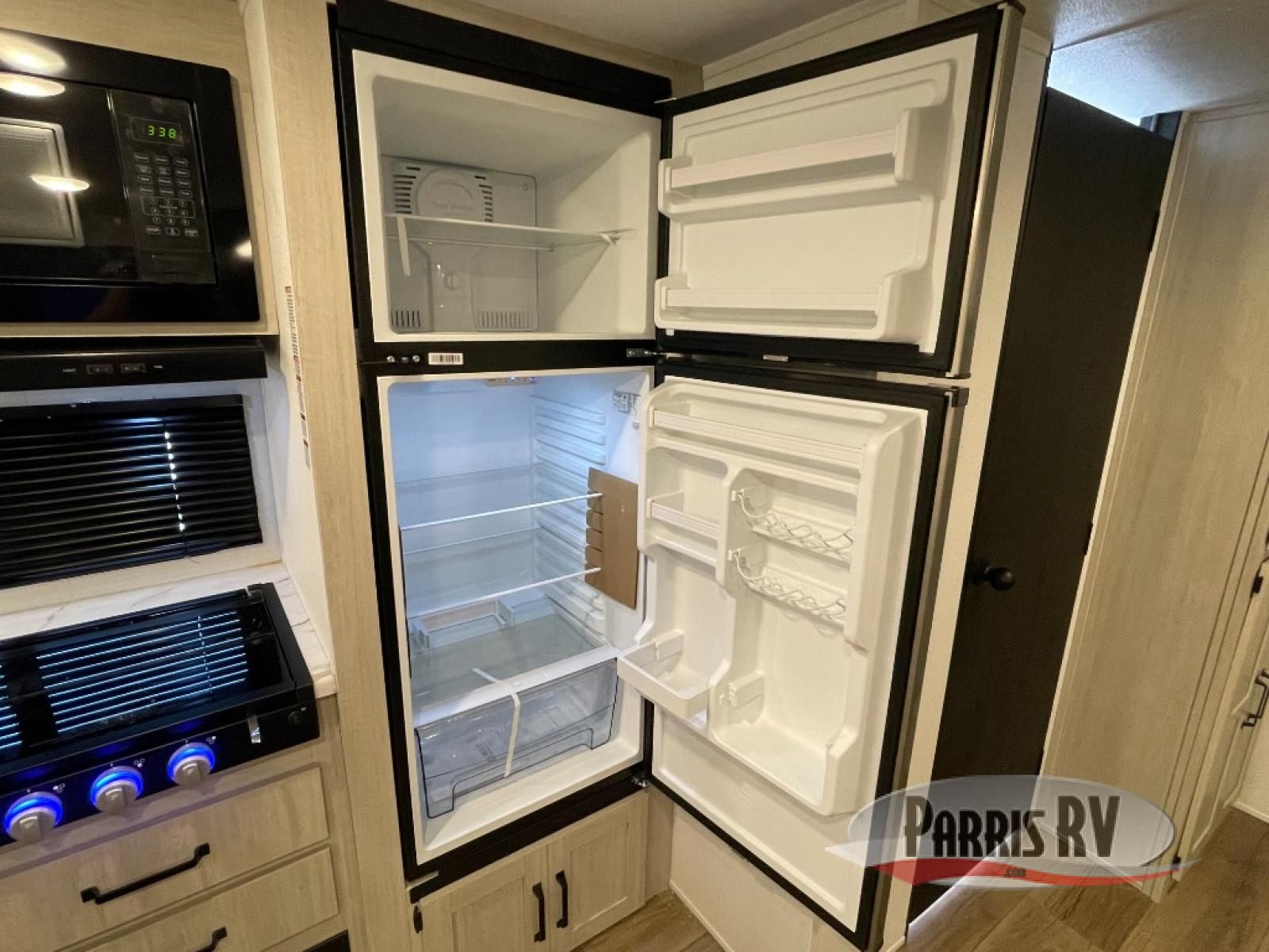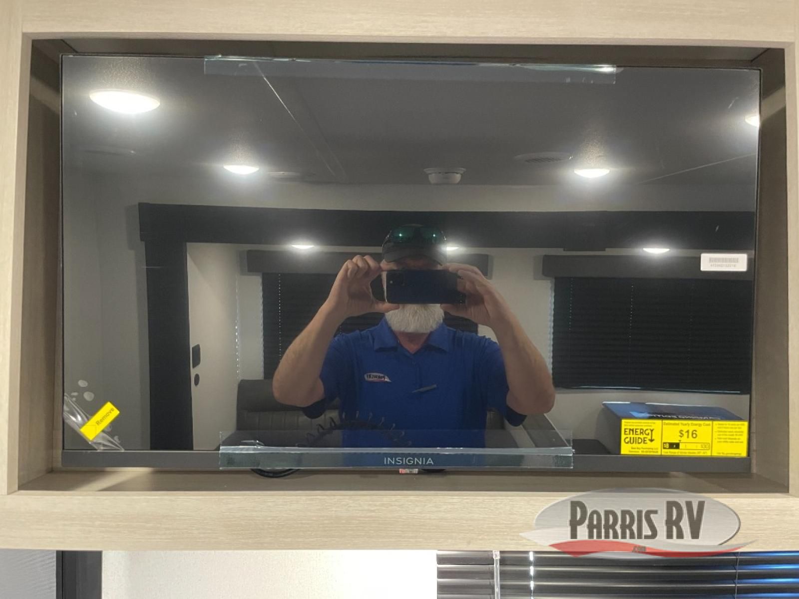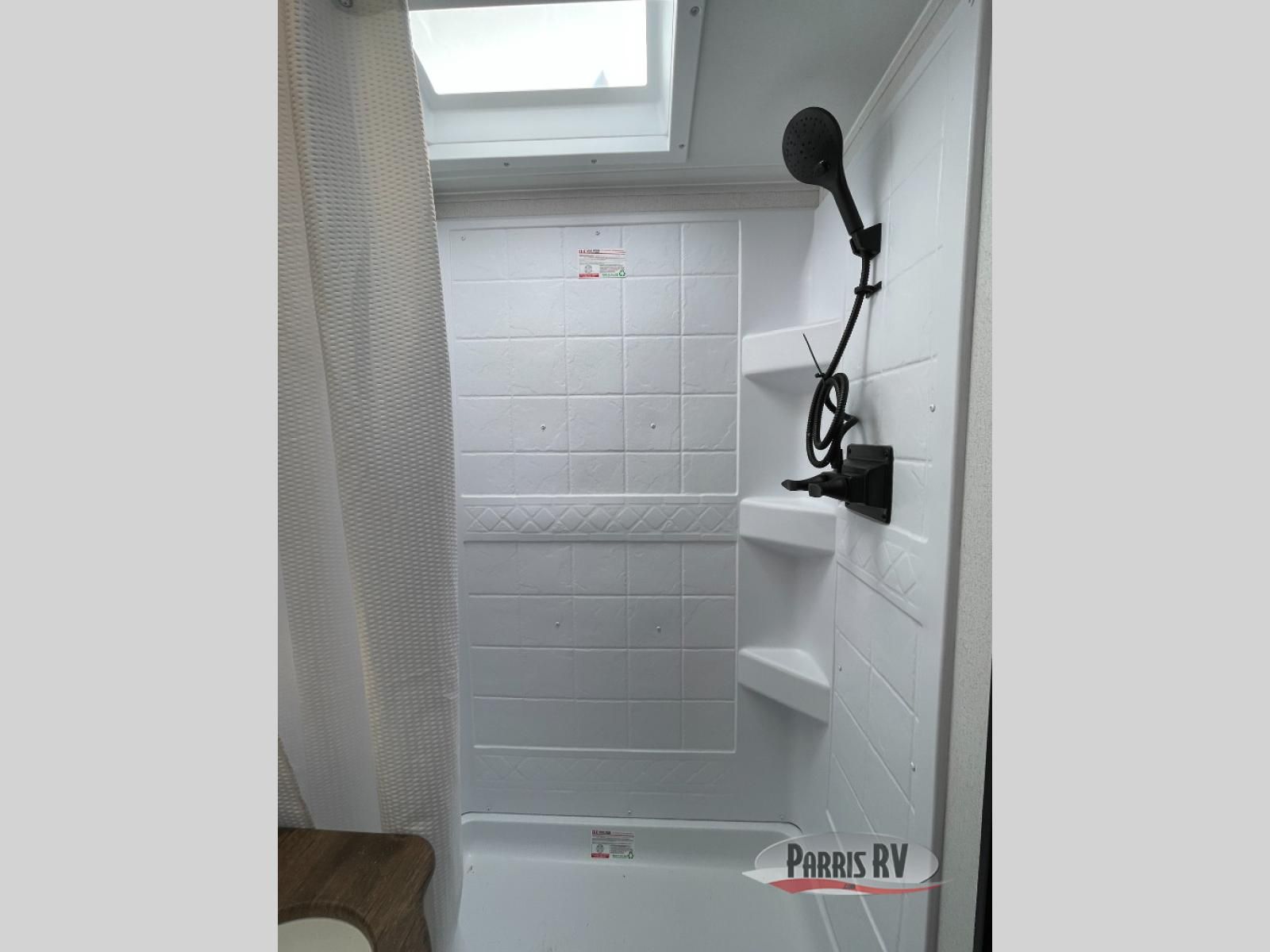 If you're looking for more space, this double axle unit features a large slide so you can walk about freely. Here, you'll find the booth dinette and sofa, which sit across from the optional TV if you want to enjoy movie nights. The full kitchen includes a stainless microwave and three burner cooktop to make meals, plus a pantry and 12V refrigerator for food storage. And an optional outside mini kitchen with a grill can be added if you enjoy cooking outdoors! Your guests or littles are sure to enjoy the rear bedroom with a queen bed, a 28" x 65" bunk, 28" x 76" bunk, a shirt closet, and a wardrobe so everything has a place!