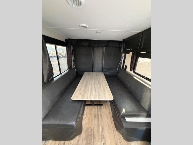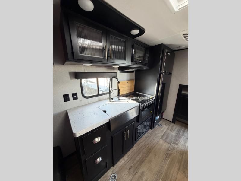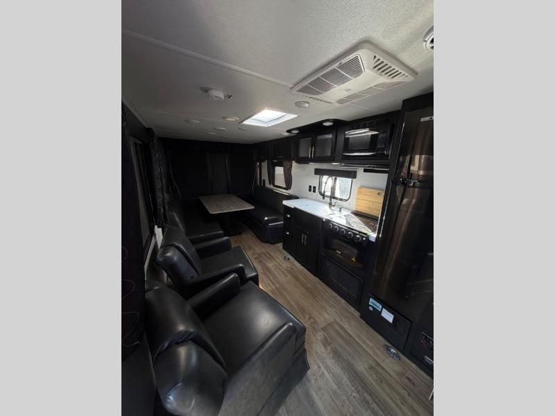 Take this Cherokee Grey Wolf toy hauler out to the campground of your choice for loads of outdoor fun! Create delicious dinners with the fabulous features found in the kitchen, like the three-burner range top, microwave, and residential farm-style stainless steel sink. For a comfortable night of rest, head to the front master suite where you will find a queen-size bed, dual wardrobes, and a TV mount. You will even be able to host any neighbors that drop by with the fold-down sofas and dinette table.