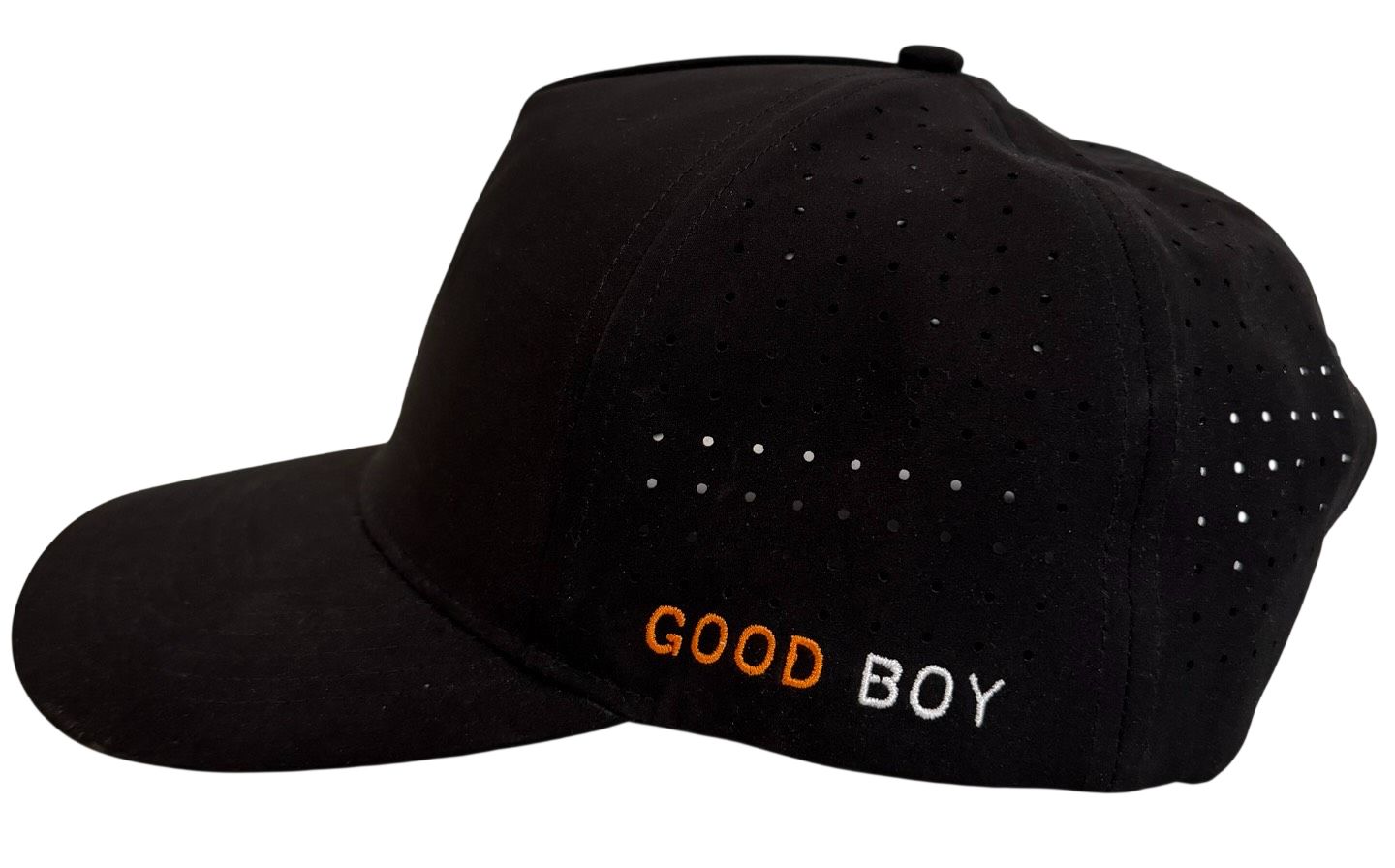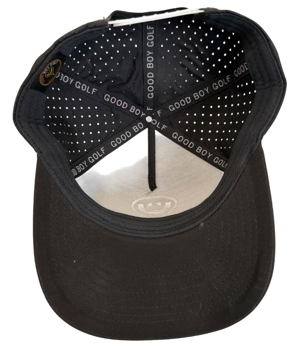 The Black & Orange Freshie Smiley Face Embroidered Golf Snapback by GoodBoy Golf is a stylish and functional golf hat suitable for both men and women. Made with a blend of polyester and cotton, this adjustable snapback features a solid black color with an embroidered smiley face logo, perfect for adding a fun and colorful touch to your golf attire. The hat also includes features like a mesh back for breathability, quick-dry technology, moisture-wicking properties, and is suitable for all seasons, making it a versatile accessory for any golf enthusiast looking to show off their style on the course.