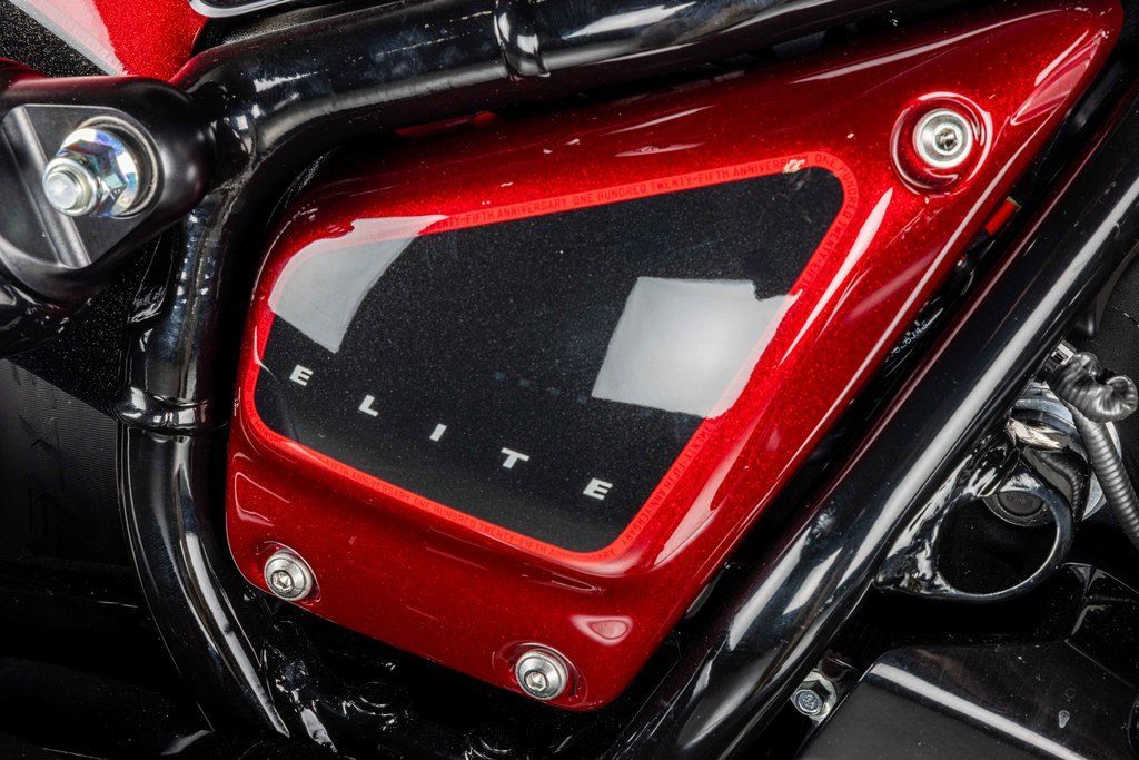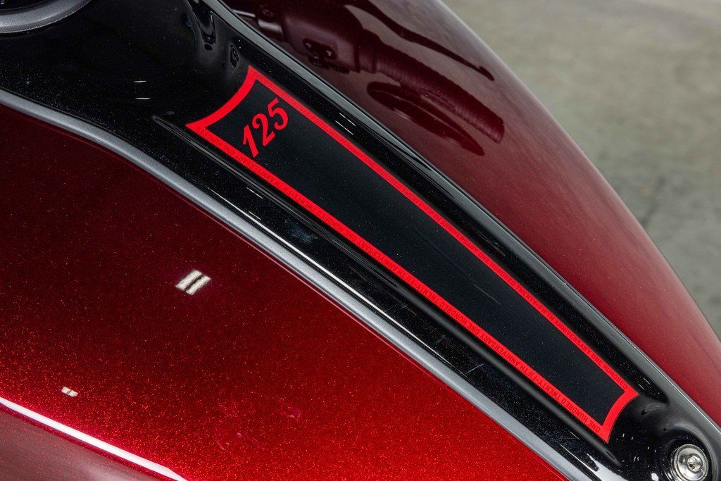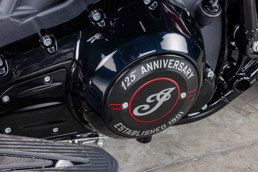 Valanced fenders and an iconic lit headdress, silver engine finishes, vintage floating seat and handlebars adorned with 125th anniversary badging throughout and meticulously hand-painted.