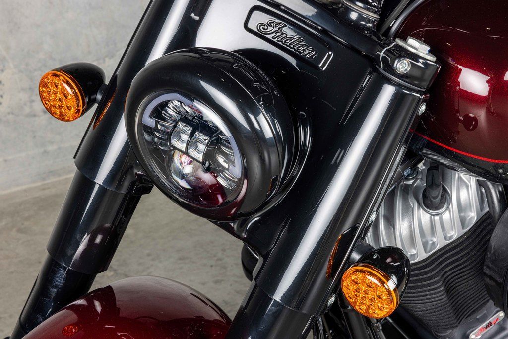 The valanced fenders, narrow rear subframe, and Vintage Bars aren’t throwback, they’re the original blueprint we created. Wire wheels are tucked under the valanced fenders with an illuminated headdress up front, an Indian Motorcycle signature since 1947.