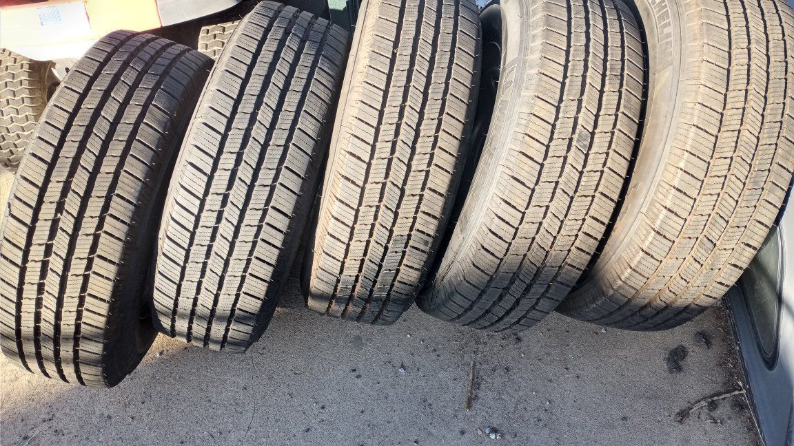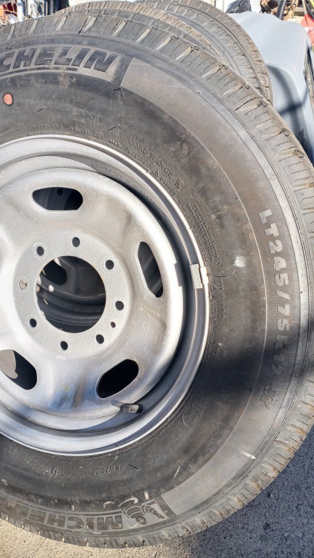 set of 5 tires and wheels / Rims Michelin LT245/75r17 very low miles 8 lug steel wheels 3/4 ton Chevy / GMC with center caps