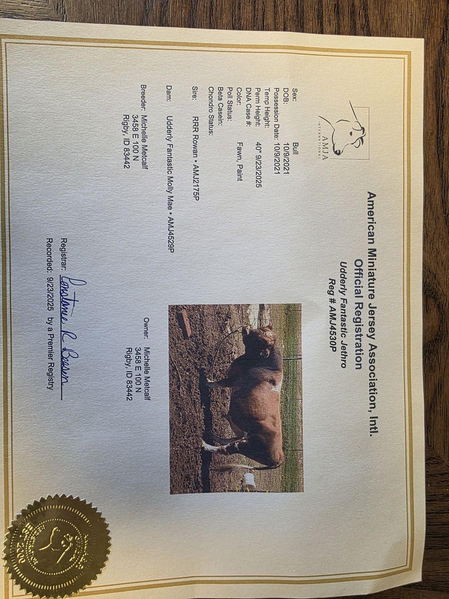 PayPalRegistered mini Jersey Bull AMJA. Friendly bull with a great temperment. Polled proven bull that is halter broke and has a nose ring. 4 year old Jethro has had his Milk protein genetic test.