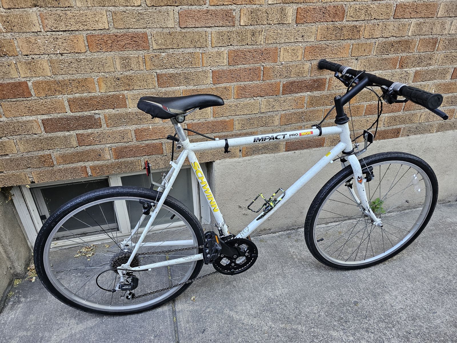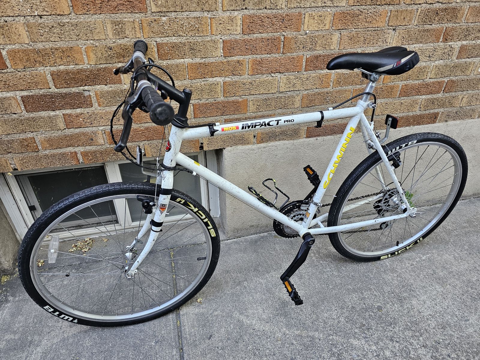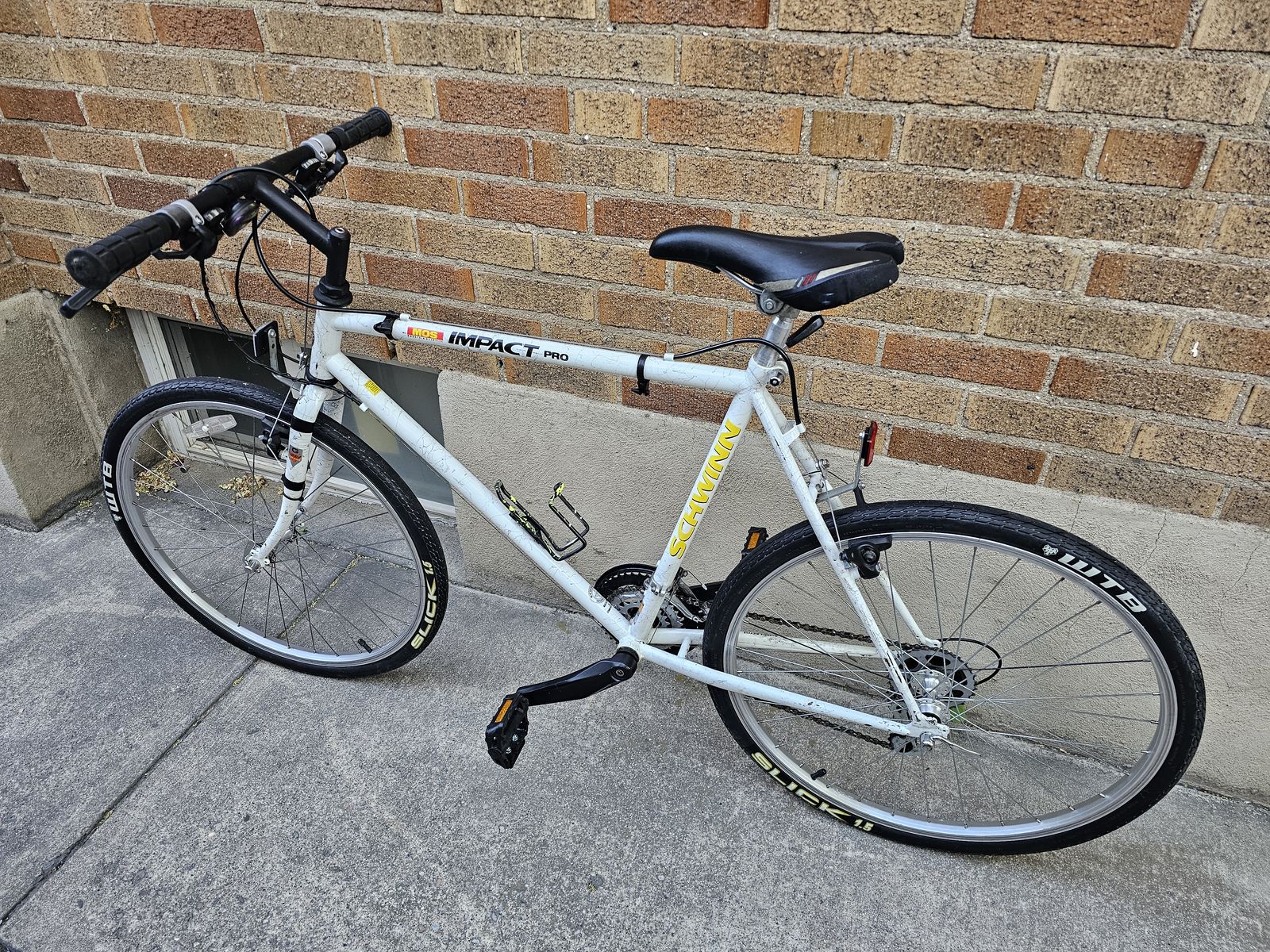 Here is a vintage Schwinn Impact Pro men's mountain bike in original splatter white paint.