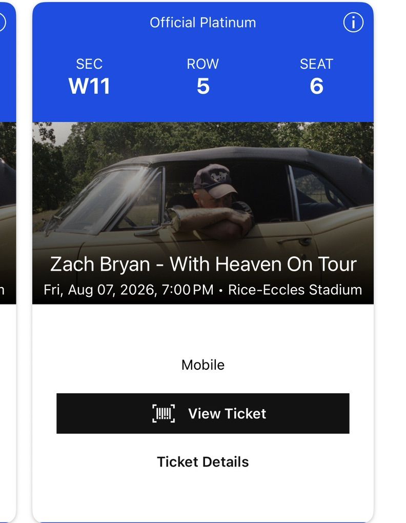 Zelle2 tickets (must buy both) to Zach Bryan’s show at Rice Eccles on August 7th. Section W11, Row 5, seats 5 & 6. Turns out we won’t be in town. Selling for what I paid.