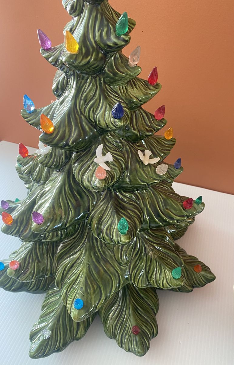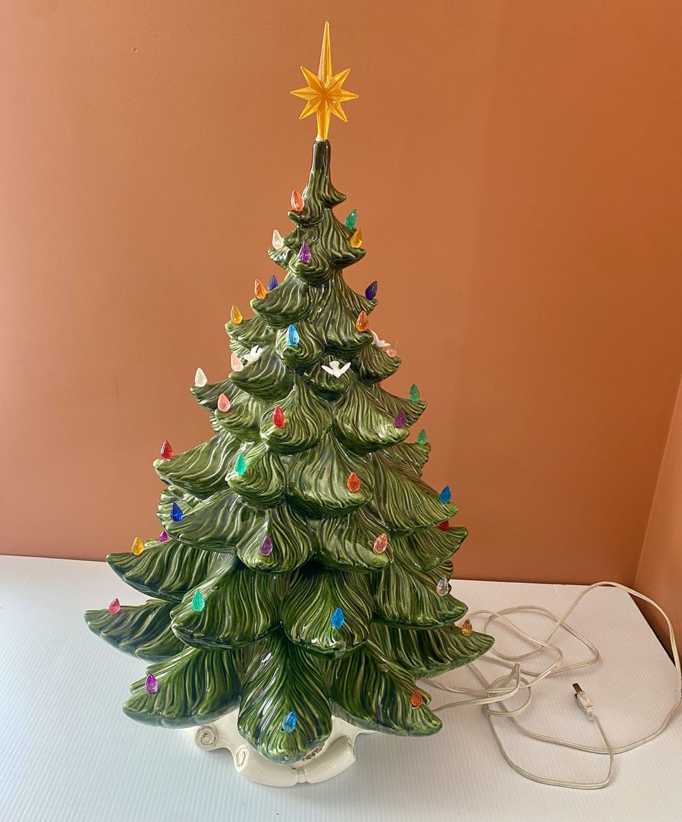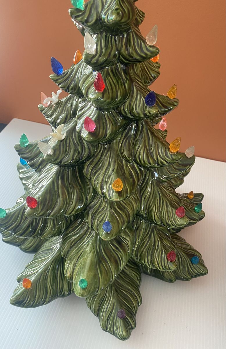 Lovely vintage condition! Huge, approx 23” tall and approx 16” wide at the widest spot. One small paint chip on the end of a branch. Previous owner had hot glued little ornament and accents. A few birds are still attached. A few little wire loops are still attached. A few bits of glue here and there though it can be carefully removed. Cord has tape on it. Light bulb lights up. Cash only, pick up in Lindon up past the new temple.