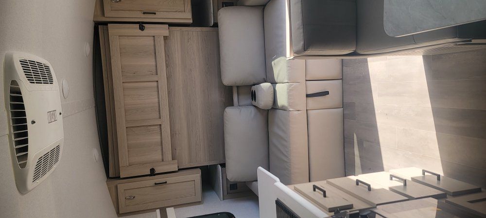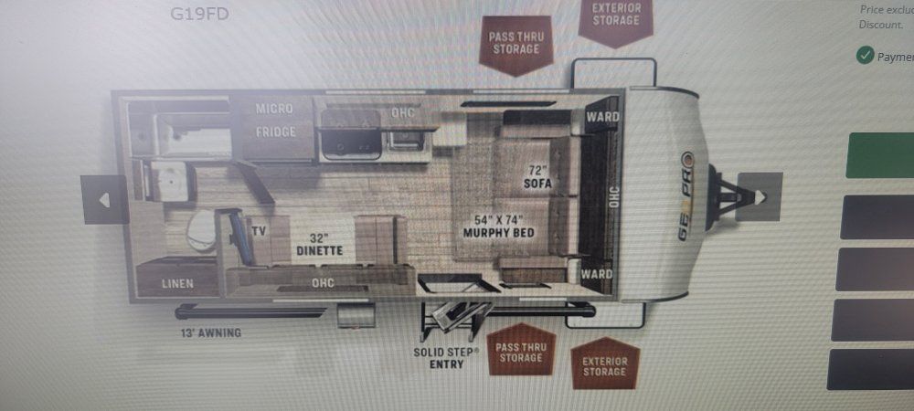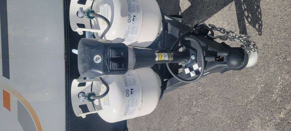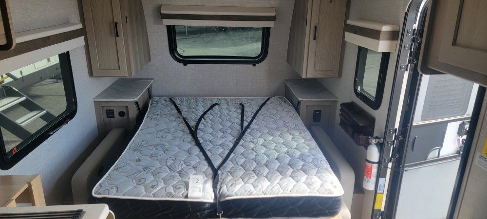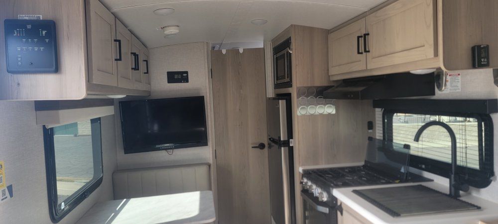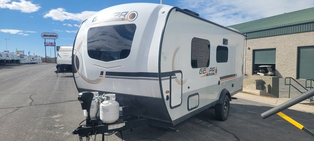 Spacious Rockwood Geo Pro travel trailer. This RV has a modern, clean interior with a kitchen, dining area, and TV. It comes with two propane tanks and a power tongue jack. Great for camping trips. Murphy bed, dinette bed, rear bathroom, Sleeps 3. Loveseat recliners when the Murphy bed is in the up position! SUPER LITE WEIGHT! 3,235 Lbs dry weight.