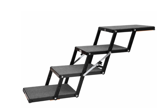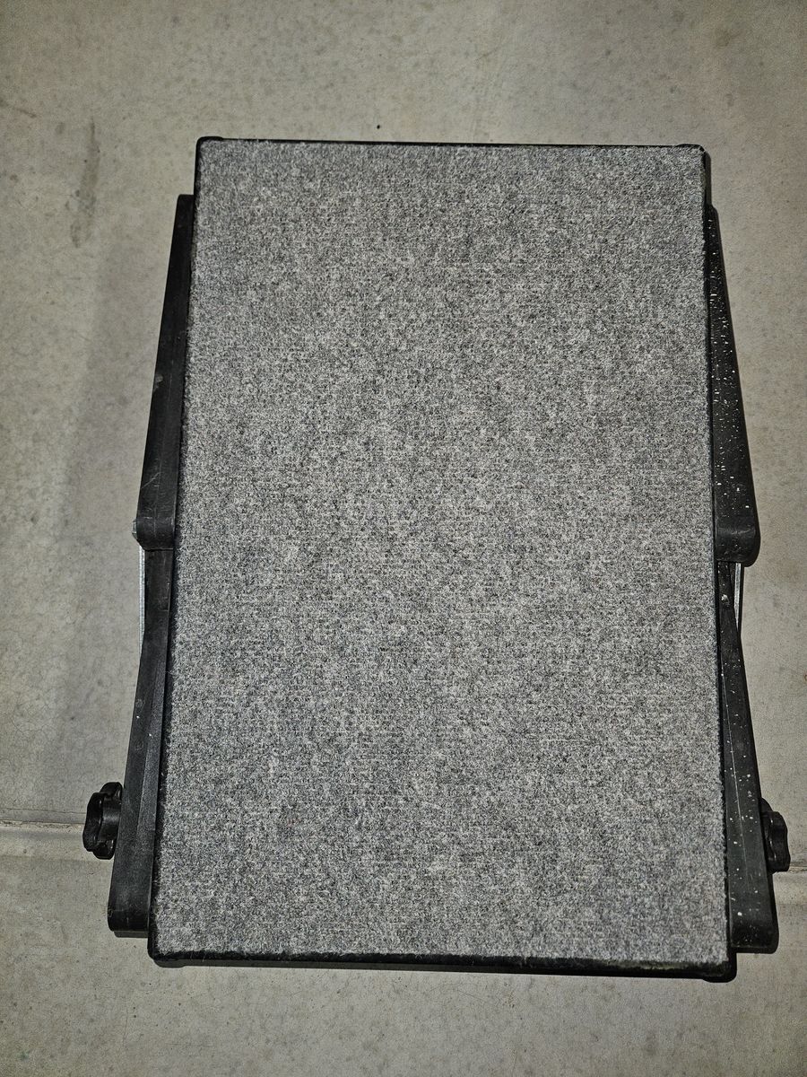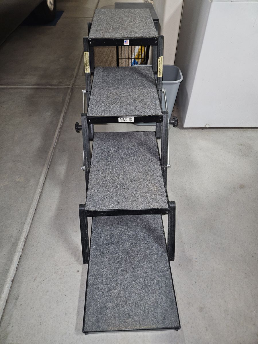 PayPalPetloader steps for getting your dog in and out of the car. Much easier on your and the dog than ramps. This is the 4 step version. Excellent quality. Easy to pick up and put in the car. Compact storage. Carpet on the stair for easy grip for your pup. My old dog with hip problems loved these steps – it made it easy for him to get in and out of my Jeep. New cost is over $300. The steps are 14 inches wide. The model is the Pet Loader Ultralight: