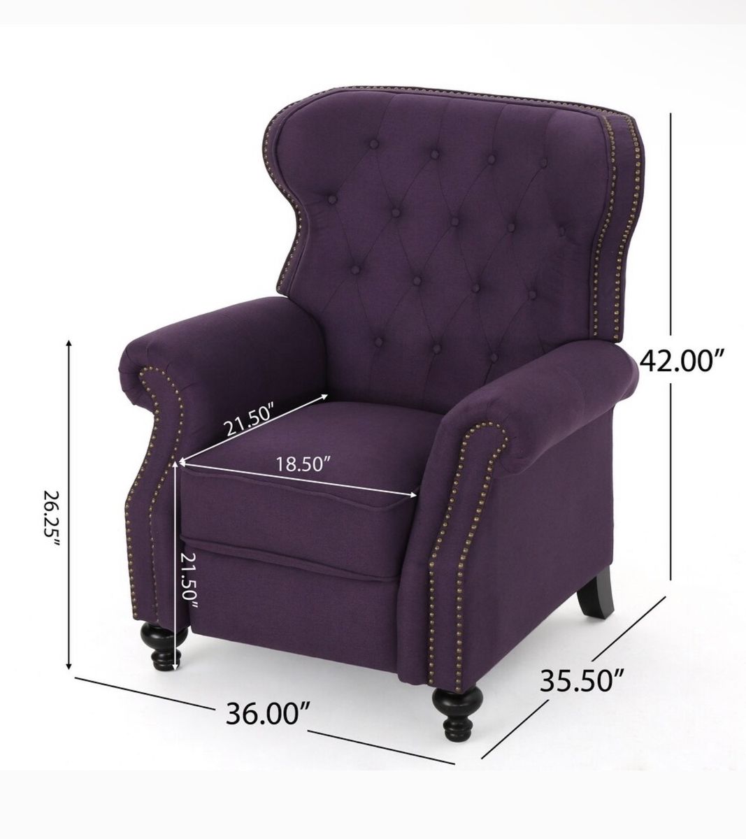 Relax and unwind in style with our charming push-back recliner, a perfect blend of elegance and comfort for your living space. Key Features: Contemporary Design: This recliner exudes modern sophistication with its button-tufted diamond stitching, rolled armrests, nailhead trim, and turned legs. The minimalistic yet refined structure effortlessly enhances your home’s aesthetic, making it a perfect addition to any room. Button-Tufted Diamond Stitch: The backrest features intricate button-tufted stitching in a diamond pattern, adding an extra layer of elegance and texture without compromising on comfort. This detail elevates the chair’s contemporary design, making it a focal point in your living space. Nailhead Accents: Expert craftsmanship is showcased in the individually applied nailhead trim that borders the edges of this recliner. These tasteful accents give the chair a handcrafted, luxurious touch, enhancing its overall appeal. Push-Back Recliner: Enjoy ultimate relaxation with the push-back recline feature. Easily lay back by applying body