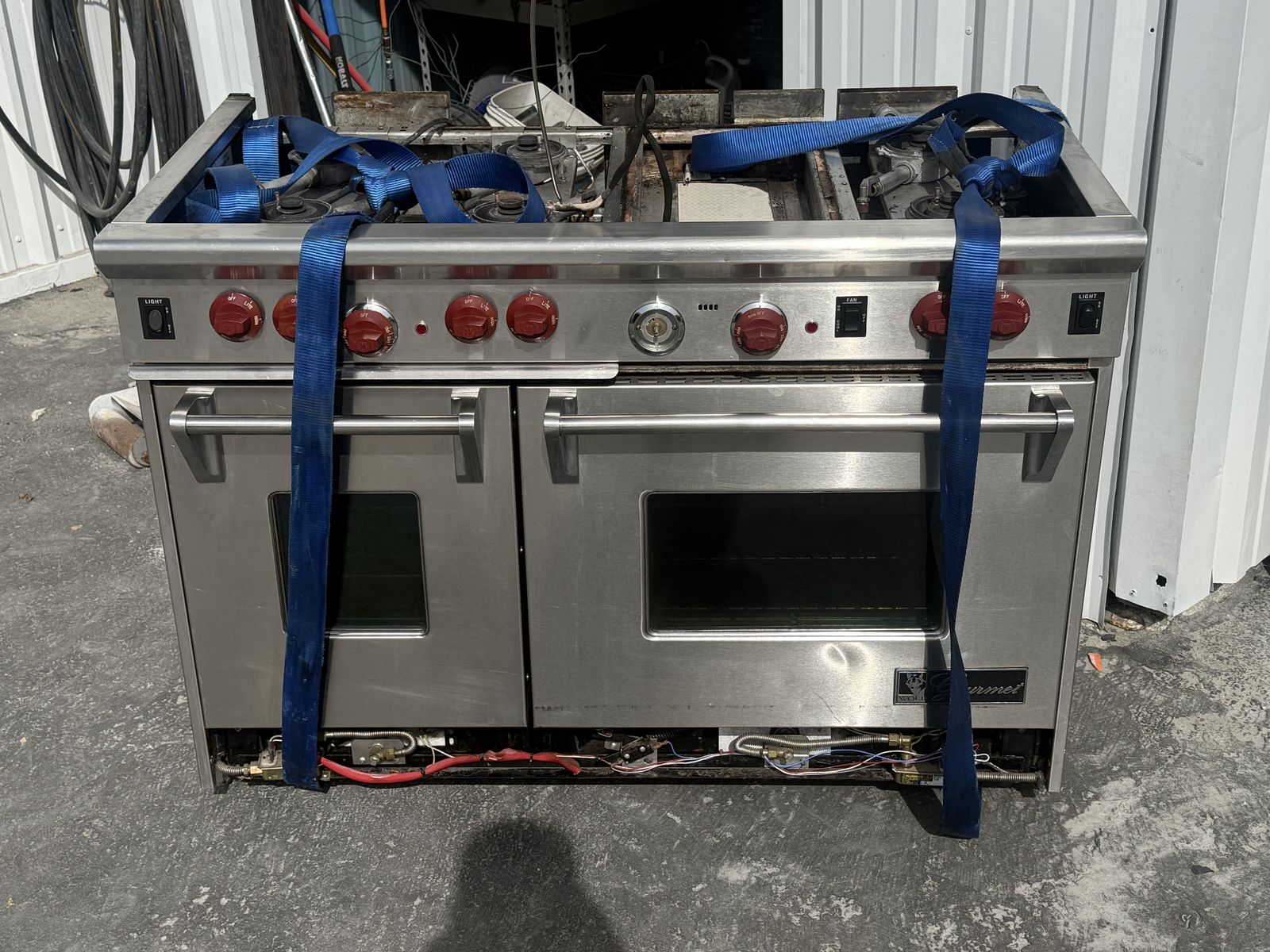 Older 48 inch wolf range…. Still works great and only replacing to for a dual fuel…. Has the large backsplash and shelf. Currently set up for propane but can be switched to natural gas easily as I have the conversion. All parts are there i just need to put everything back together. It was difficult to move upstairs and so I tried to minimize the weight. Open to offers