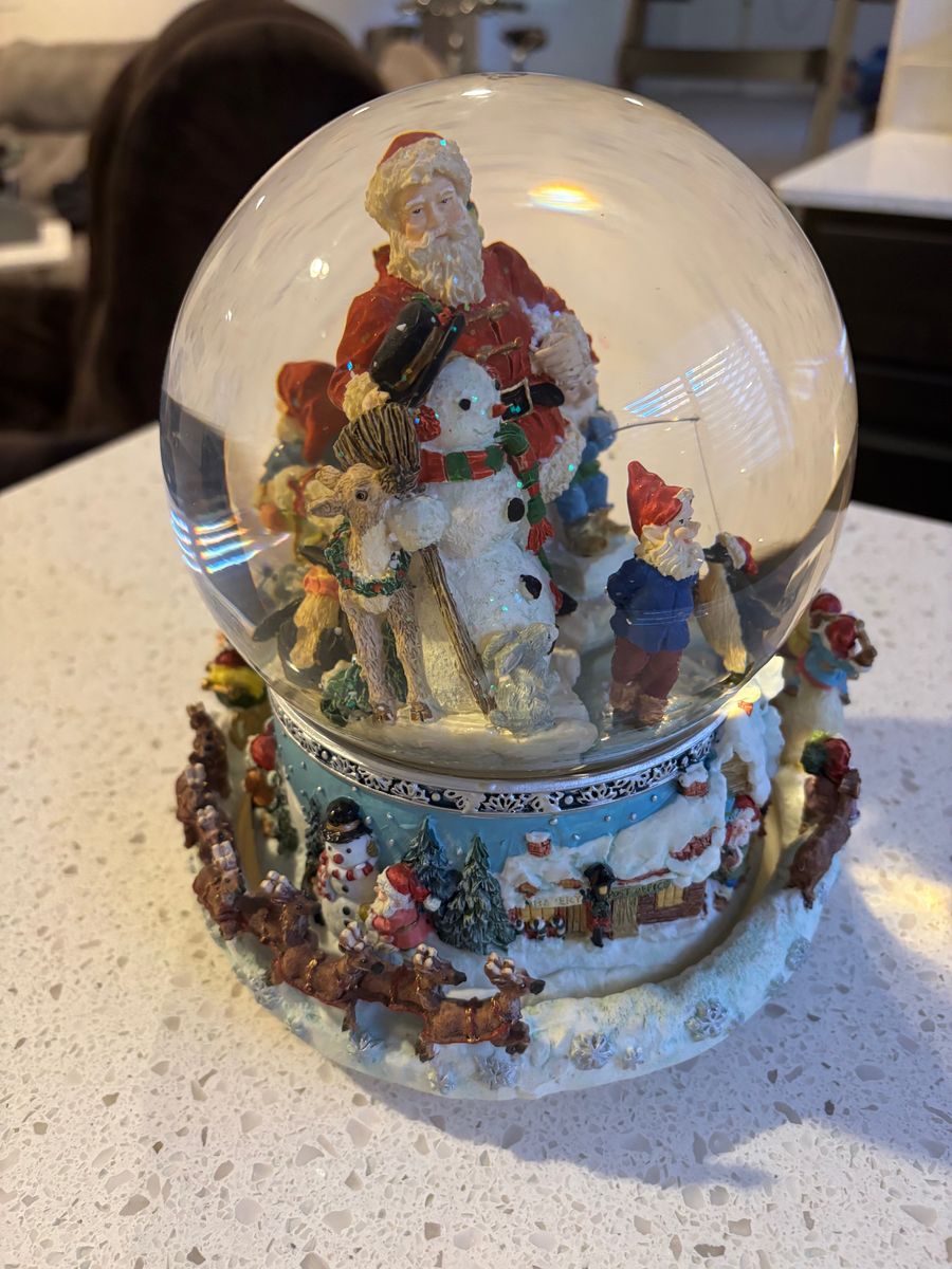 VenmoLarge Christmas Snow Globe. Very detailed and well made. Base rotates around as music plays. Approximately 7 Inches tall and 7 inches in diameter