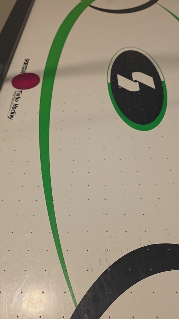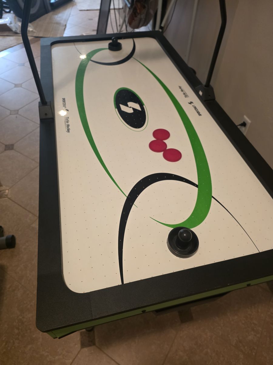 VenmoSmall air hockey table. 57 inches long by 27 inches wide. 30 inches tall. Battery powered score keeping.