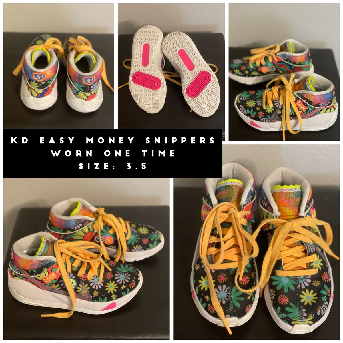 •Kd easy money snippers: Worn one time, Size: 3.5