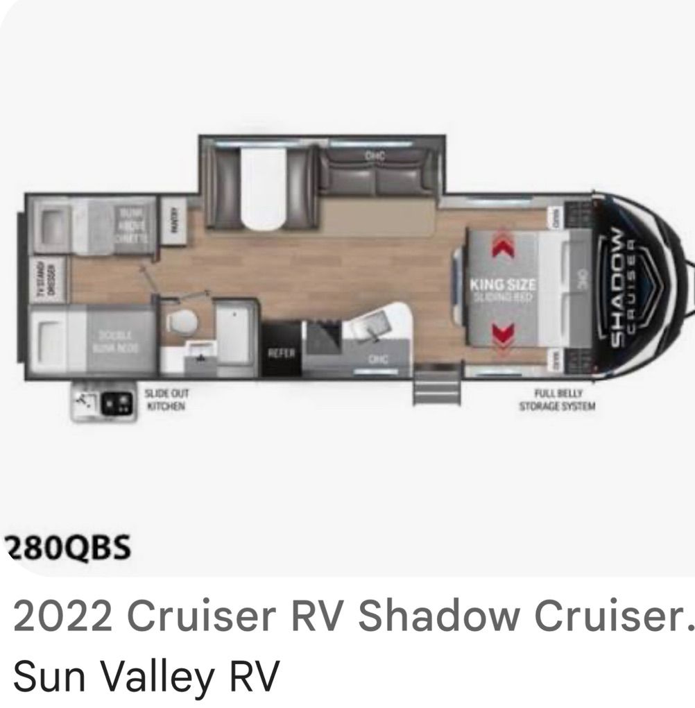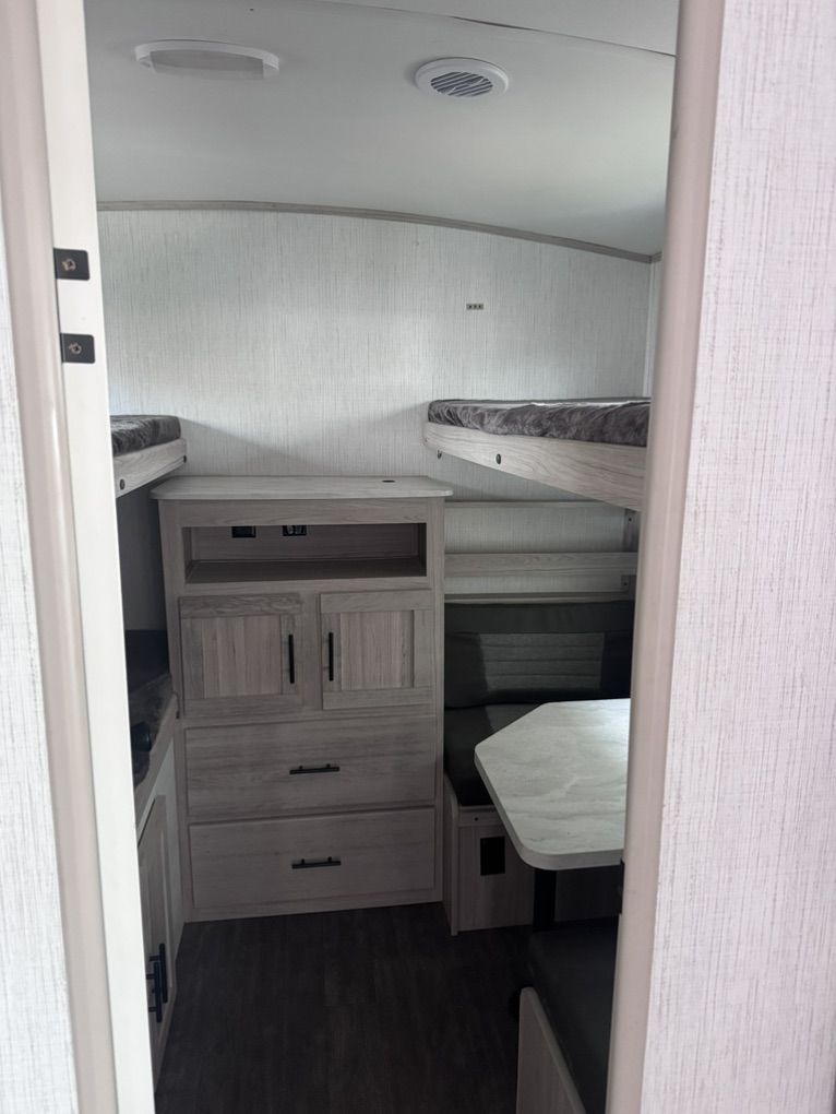 280 QBS. This is a quad bunkhouse with one of the bunk houses can convert to a table where kids can play games and there’s a spot for a TV as well with some dressers. The door does shut too!