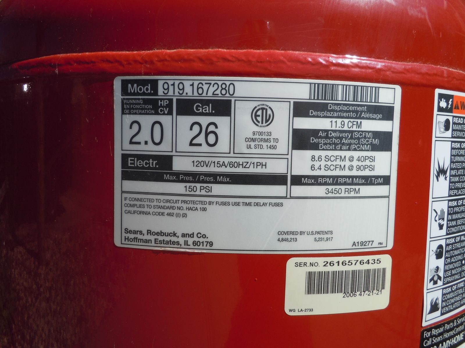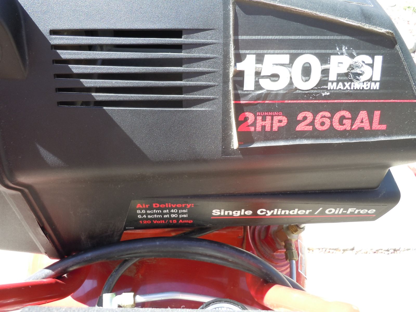 150 PSI 2 HP 26 GAL. Excellent condition. Works great. Comes with air tools that have never been used.