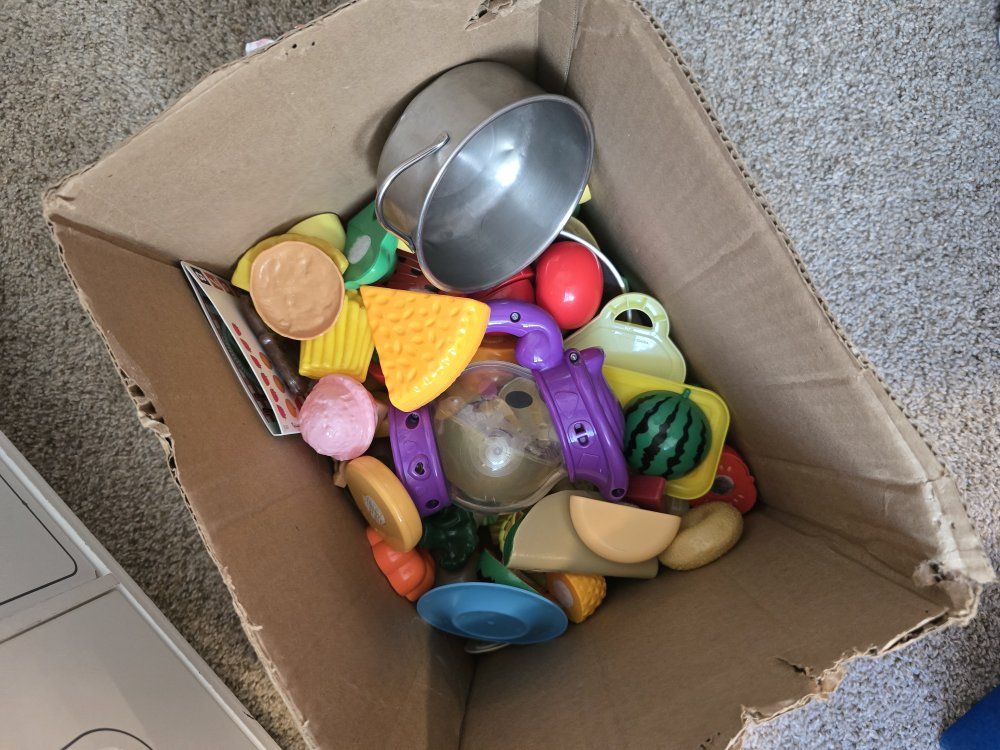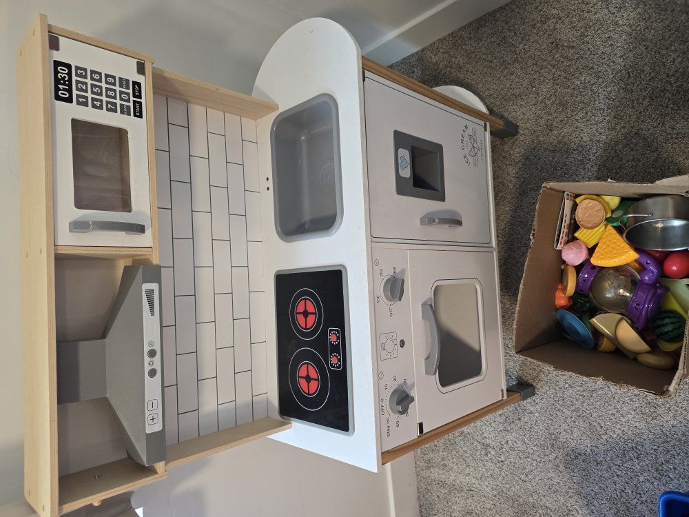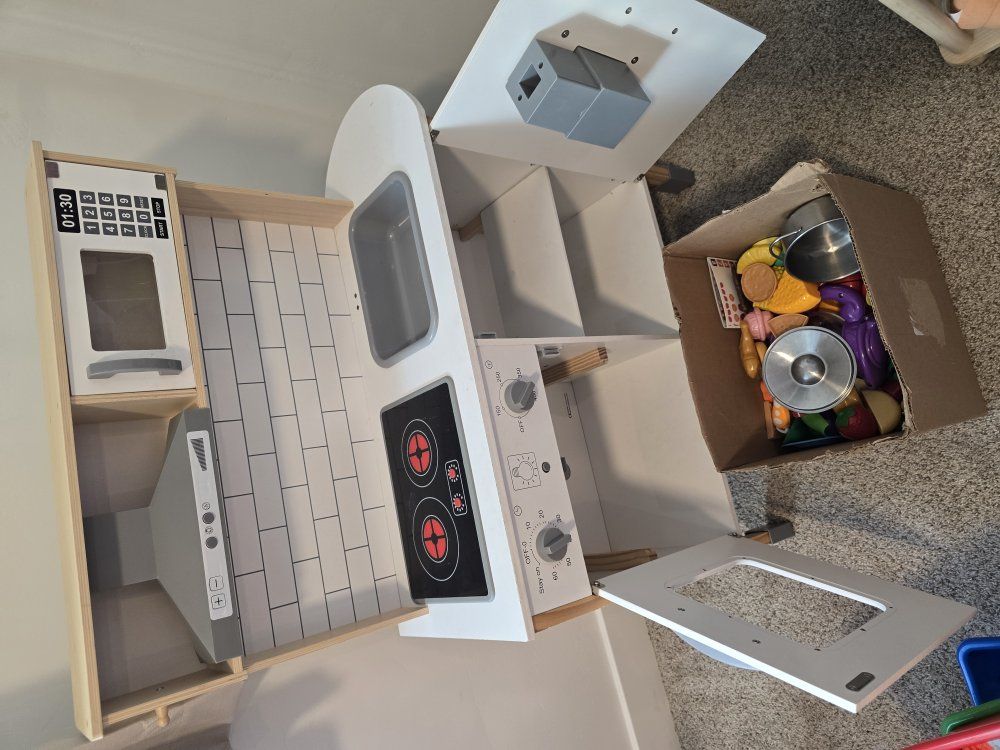 Tiny Land® Interactive Play Kitchen with Sounds & Cookware- Comes with a box of play foods, pot & pan. Sounds & lights work. Has a couple cracks but still works great. No sink faucet but you can order that part for $6 on their website. $50