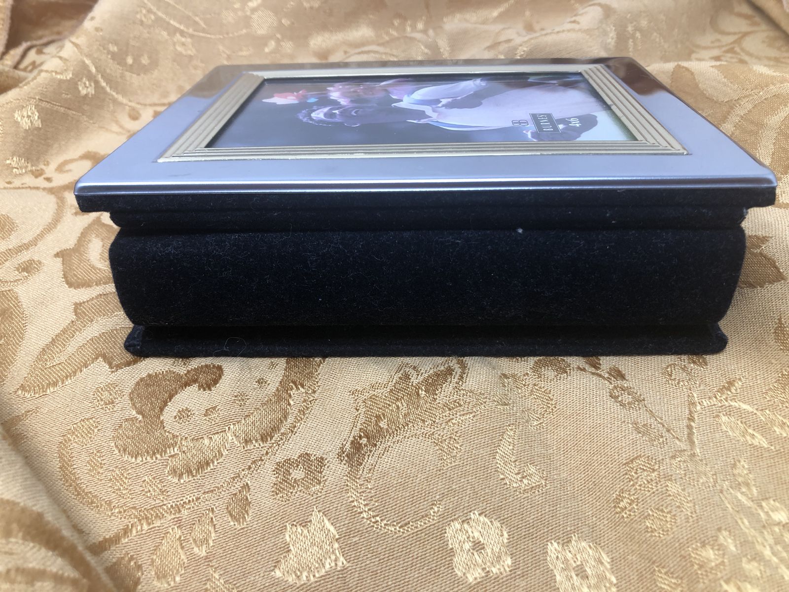 Front Cover: Features a sophisticated dual-tone metal frame with a polished silver-tone finish and a nested gold-tone border.