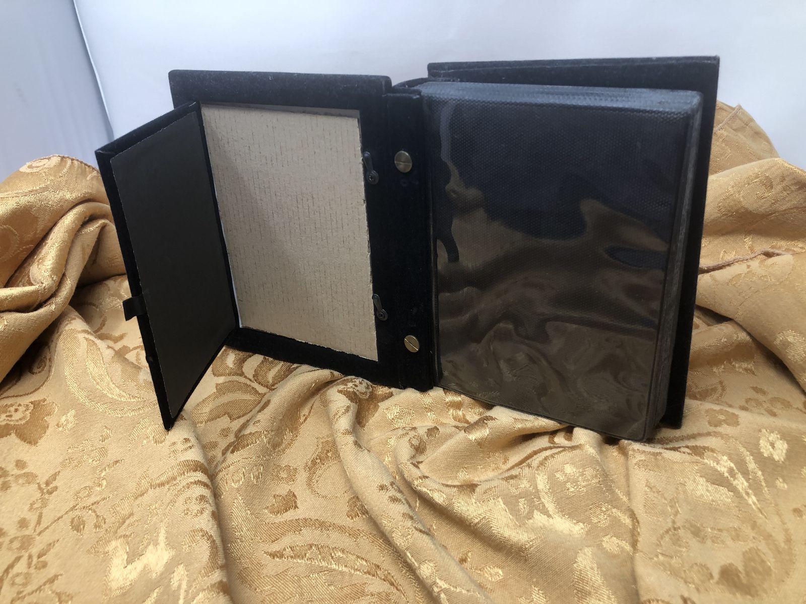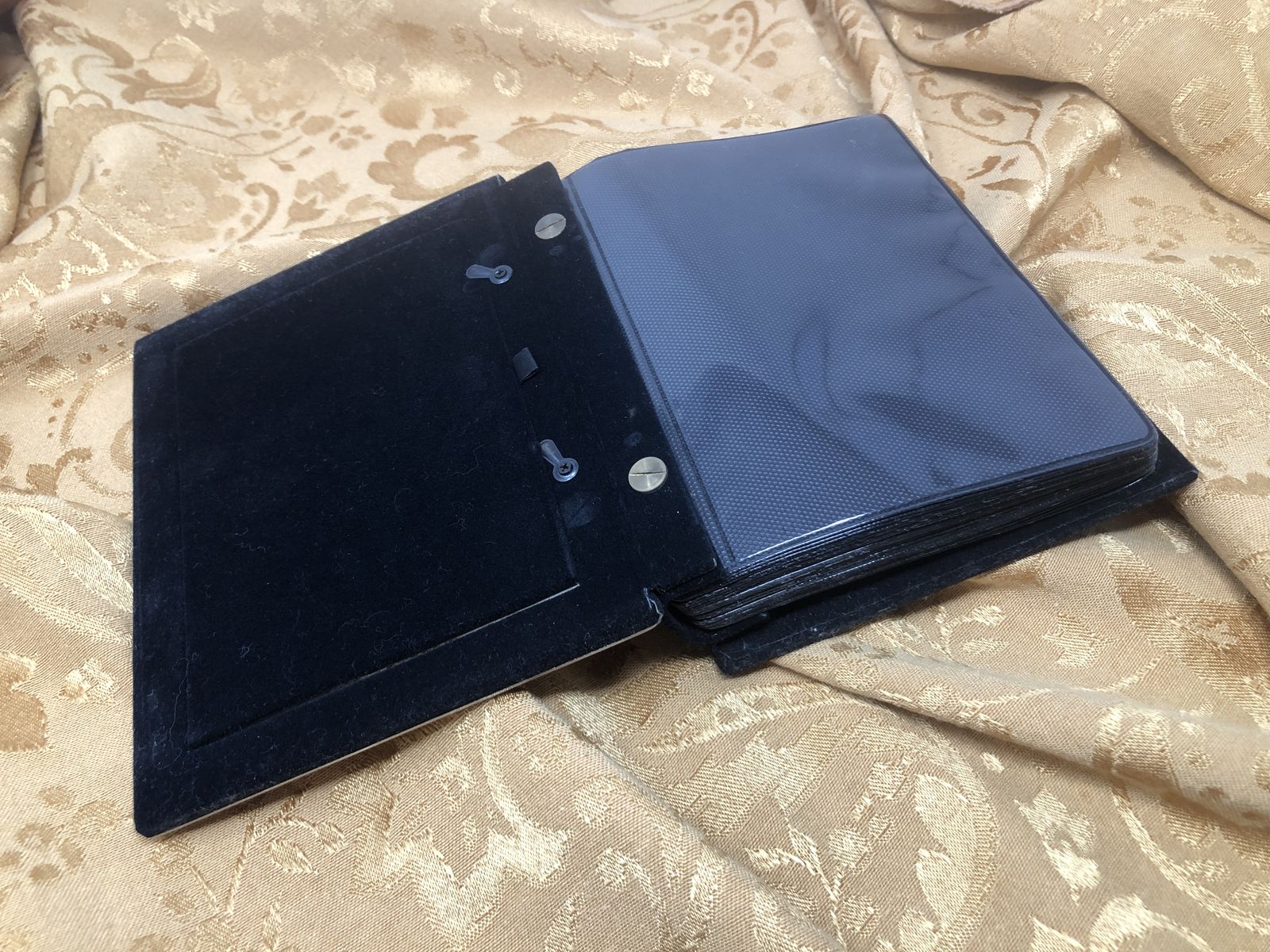 Interior: The sleeves are made of clear, durable plastic (wallet-style) for easy viewing. The interior hinges and backing are lined with a soft, black velvet-like fabric for a luxurious touch.