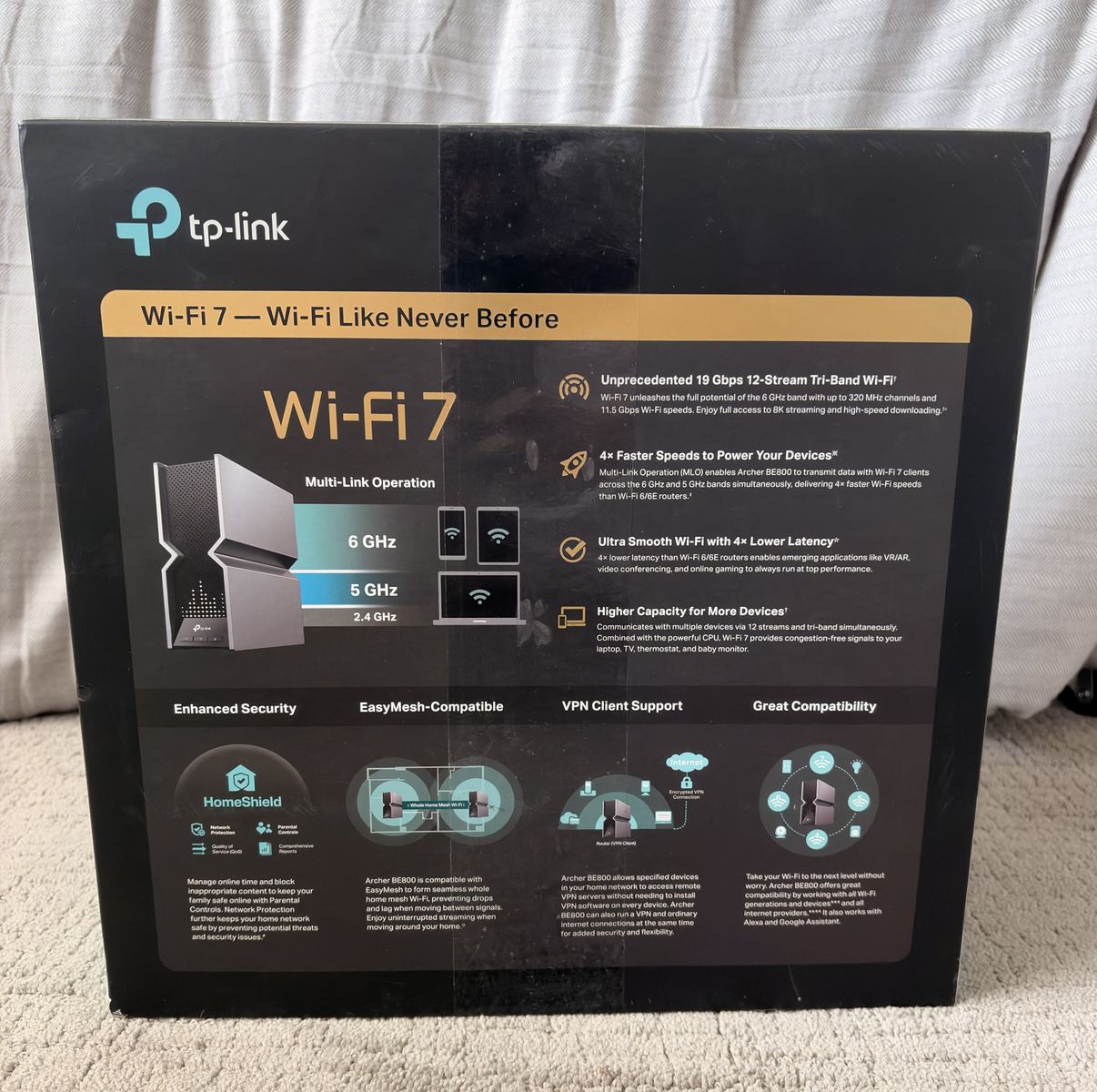 Lightning-Fast BE19000 Tri-Band Wi-Fi 7 SpeedsArcher BE800 is designed with the latest Wi-Fi 7 technology, featuring Multi-Link Operation, Multi-RUs, 4K-QAM, and 320 MHz channels. With speeds of 11520 Mbps on the 6GHz band, 5760 Mbps on the 5GHz band, and 1376 Mbps on the 2.4GHz band, the Archer BE800 delivers fluent 4K/8K streaming, immersive AR/VR gaming and unparalleled Wi-Fi performance.