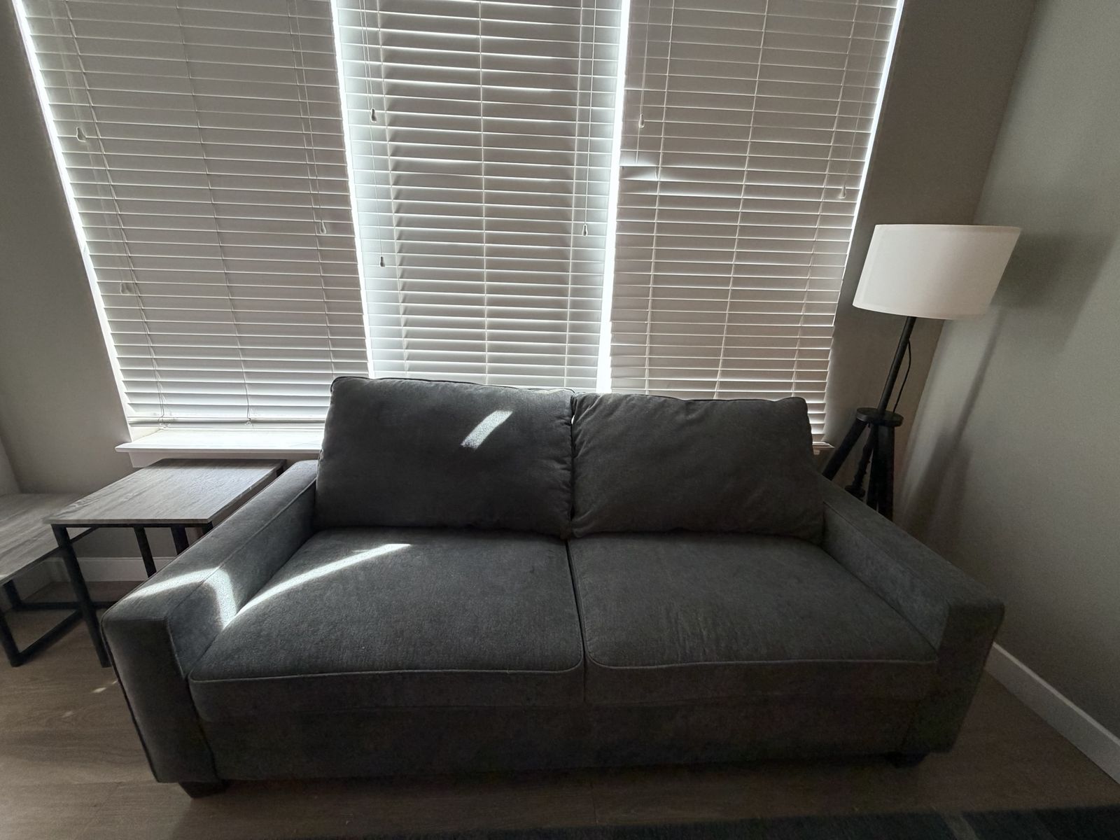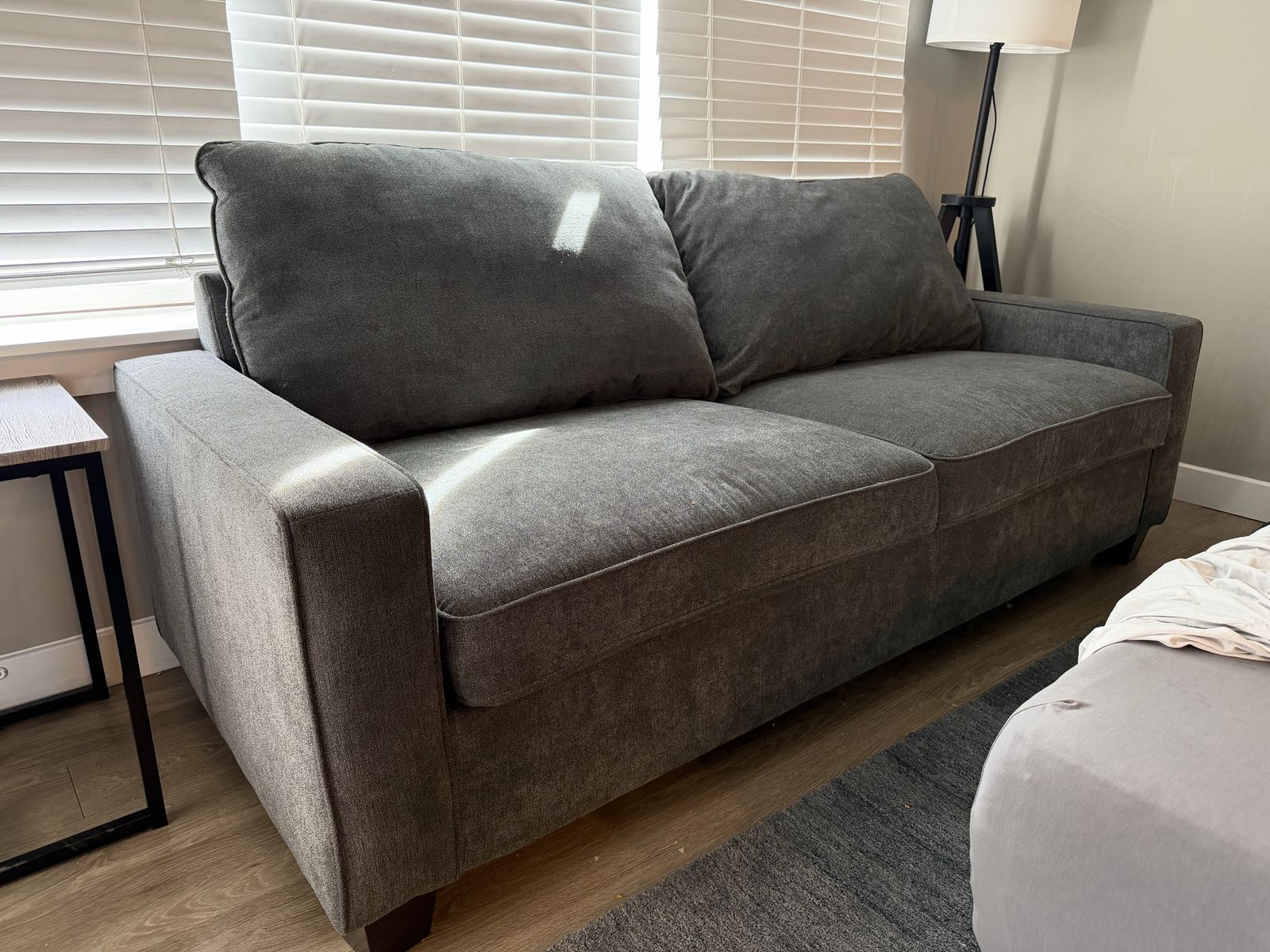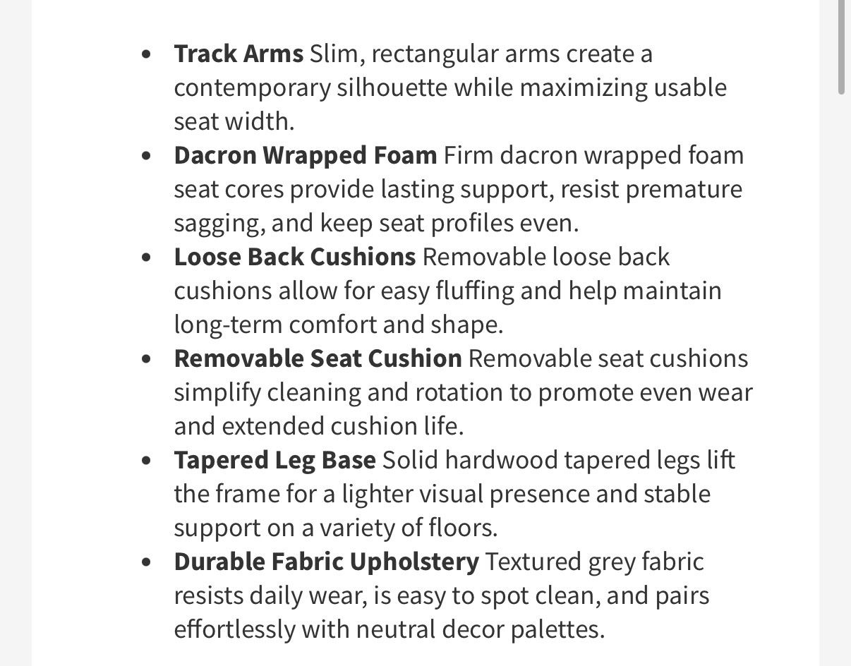 VenmoReid Grey Fabric 80 Inch Sofa brings modern living room furniture sensibility to compact spaces with a clean, contemporary profile suited for apartments and dorm rooms. Upholstered in a textured grey fabric, it pairs firm dacron wrapped foam seat cores with loose back cushions to deliver supportive, deep-seated comfort for everyday use. Track arms and a streamlined rectangular silhouette with welted edges keep an uncluttered look while tapered solid hardwood legs provide visual lightness. The firm comfort level and consistent support make this sofa a dependable option for both casual lounging and more formal seating.
