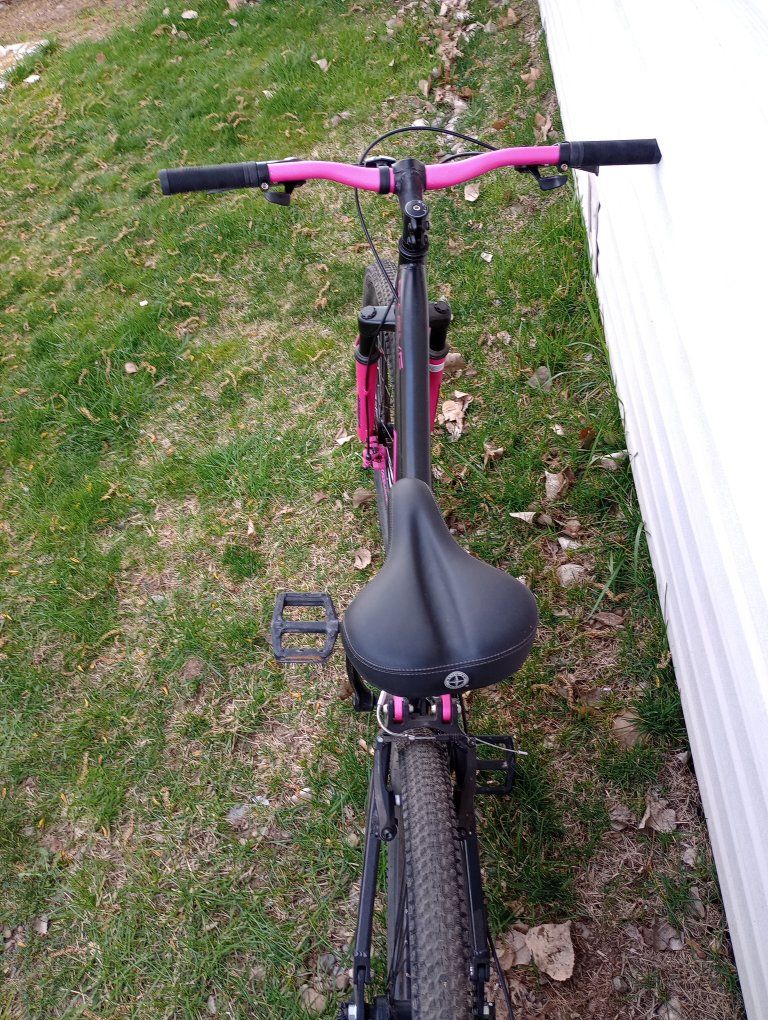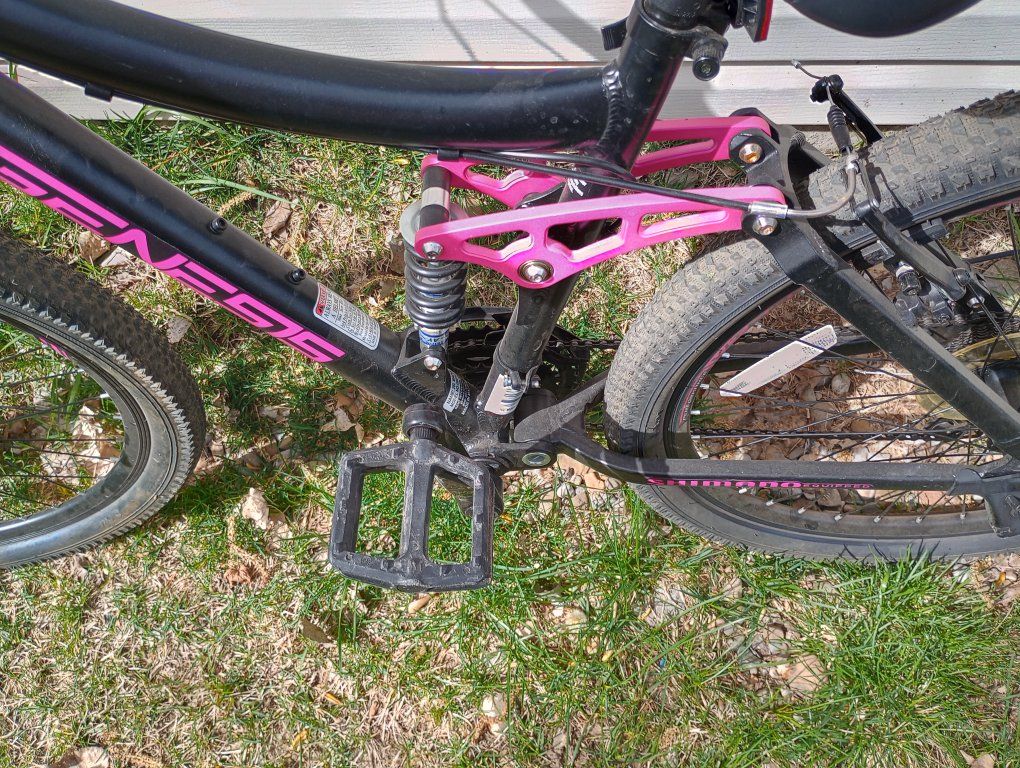 Durable Frame: Aluminum frame mountain bike designed for women 5'2" and taller Adjustable Seat: Quick-release seat post allows for easy seat height adjustments Reliable Brakes: Front disc brakes and rear linear-pull brakes provide steady stopping power Multiple Speeds: 21-speeds with Shimano rear derailleur for smooth shifting Traditional Pedals: Equipped with traditional plastic pedals for a familiar feel Dual Suspension: Front and rear suspension for a comfortable ride on various terrains Stylish Design: Black with hot pink accents for a stylish yet functional look