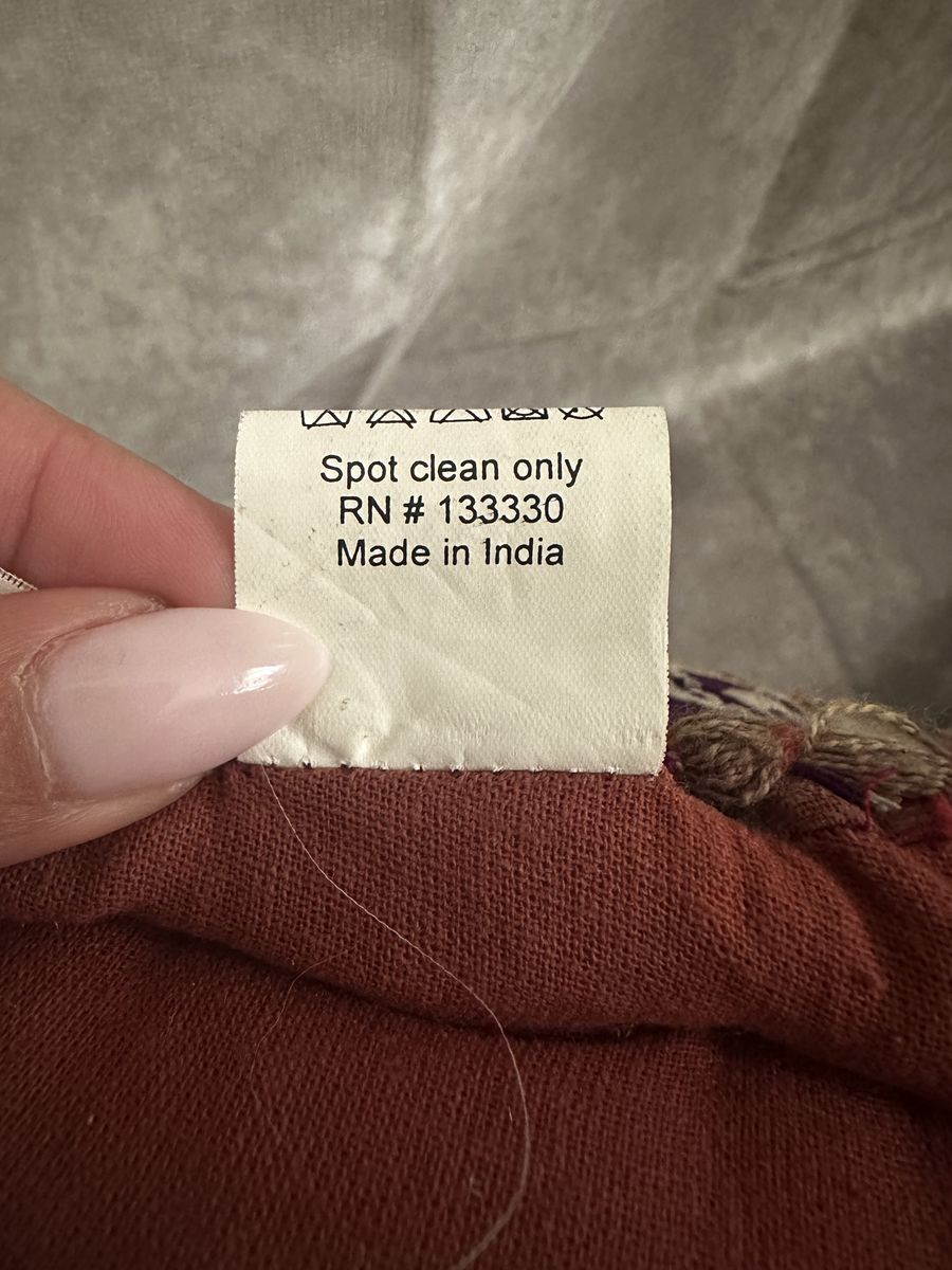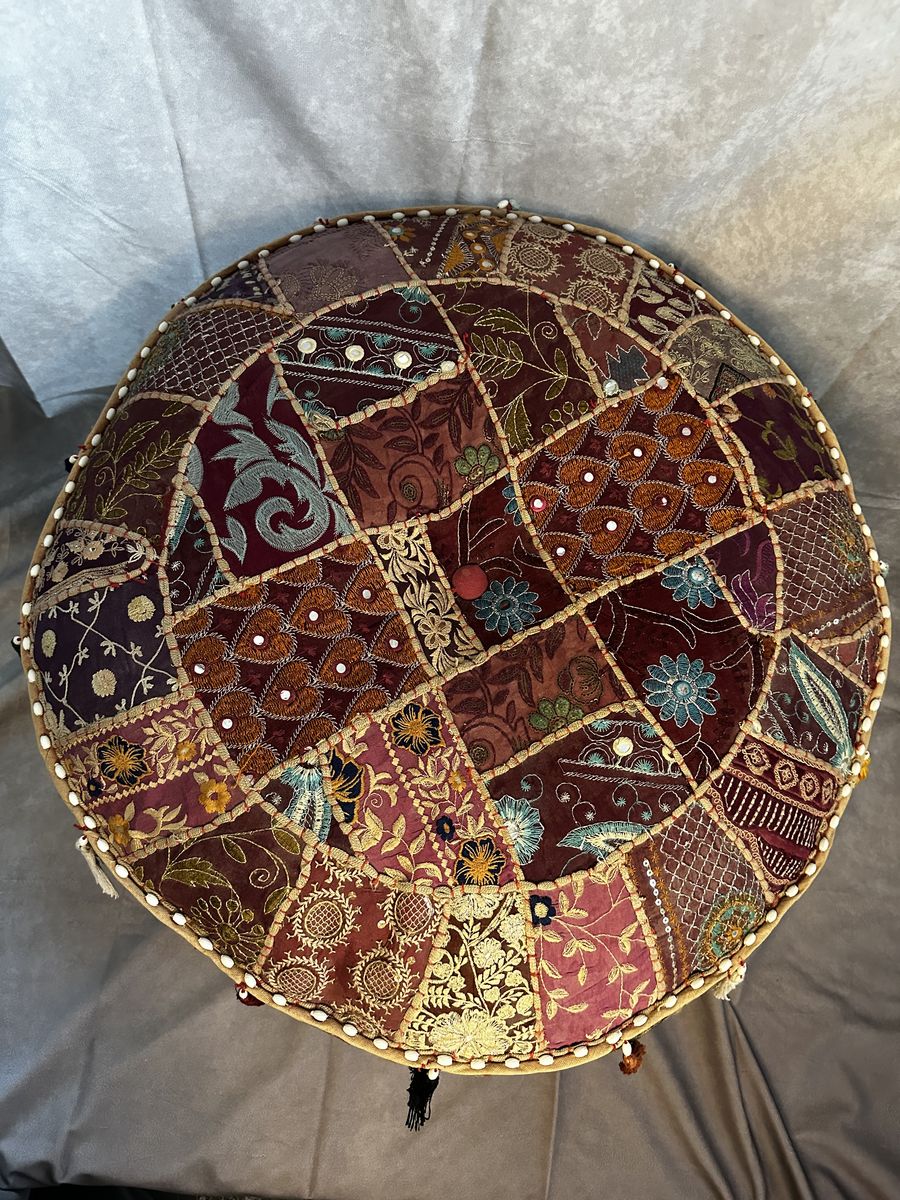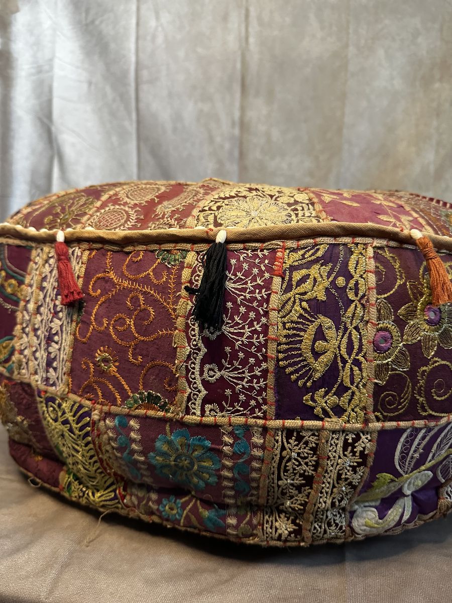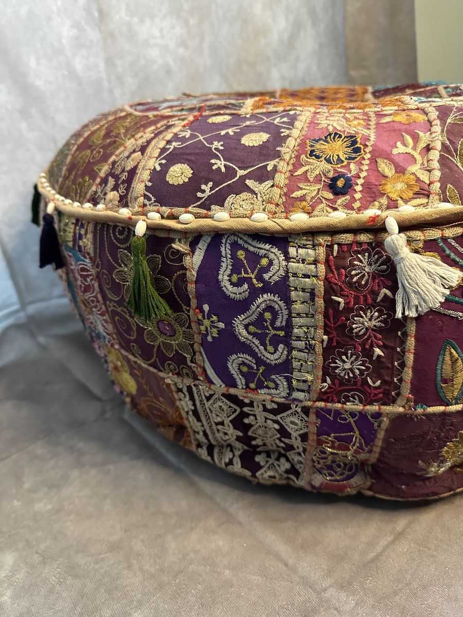 VenmoBoho patchwork floor pouf / ottoman with embroidered detailing and mixed textiles (includes silk). Fully stuffed and ready to use.