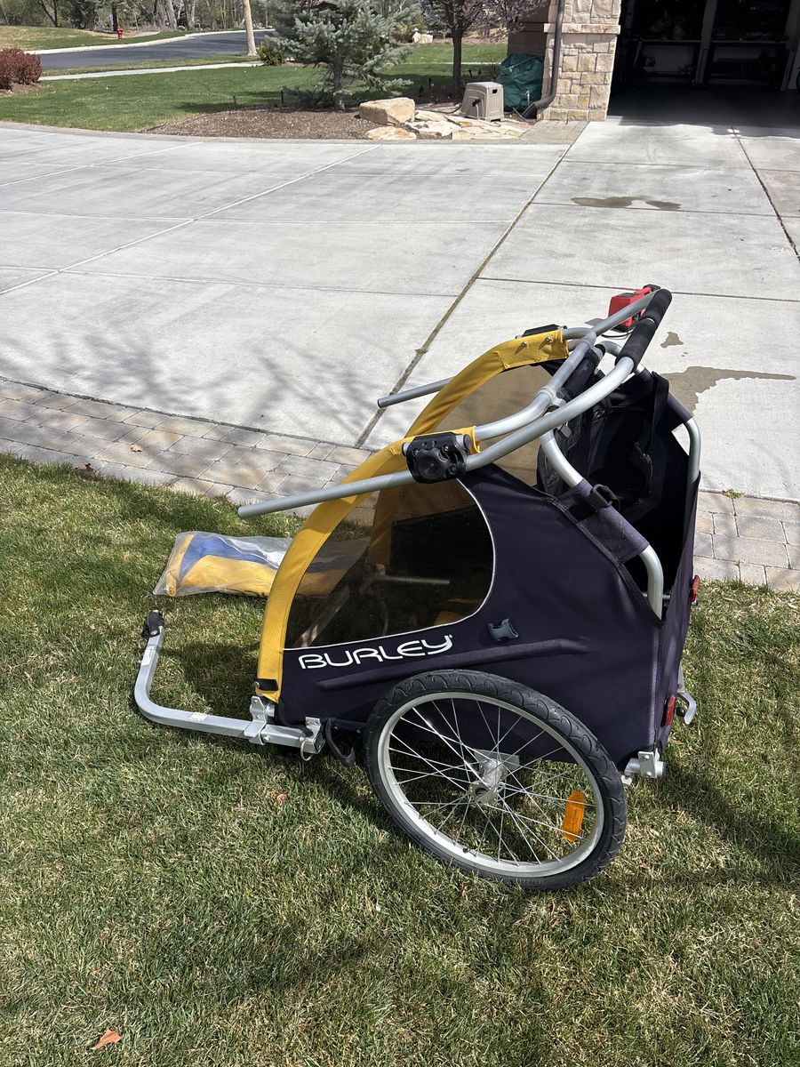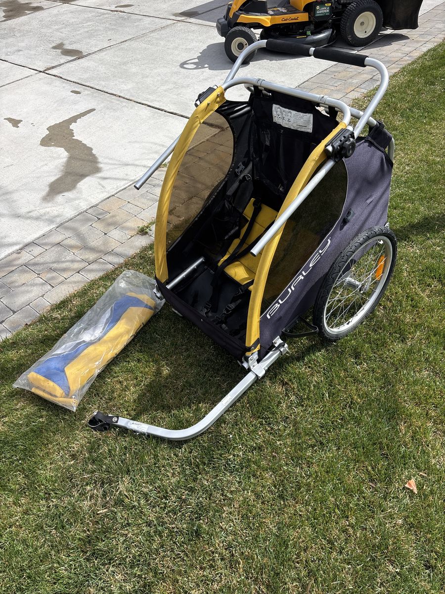 Burley Bike trailer attaches to your bike so you can tow your kids around.