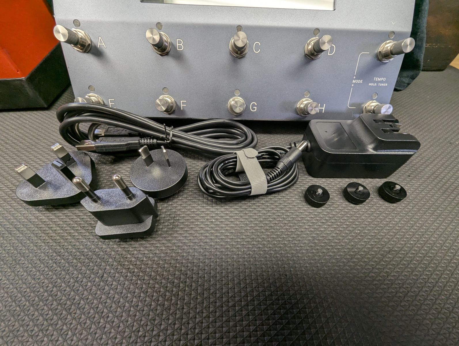 Comes with the original power supply, the original USB (unused, I have others), adapters for international use, and three temple audio quick connects (can be cleanly removed upon request, but they're the best setup to put this thing on a board imo!)