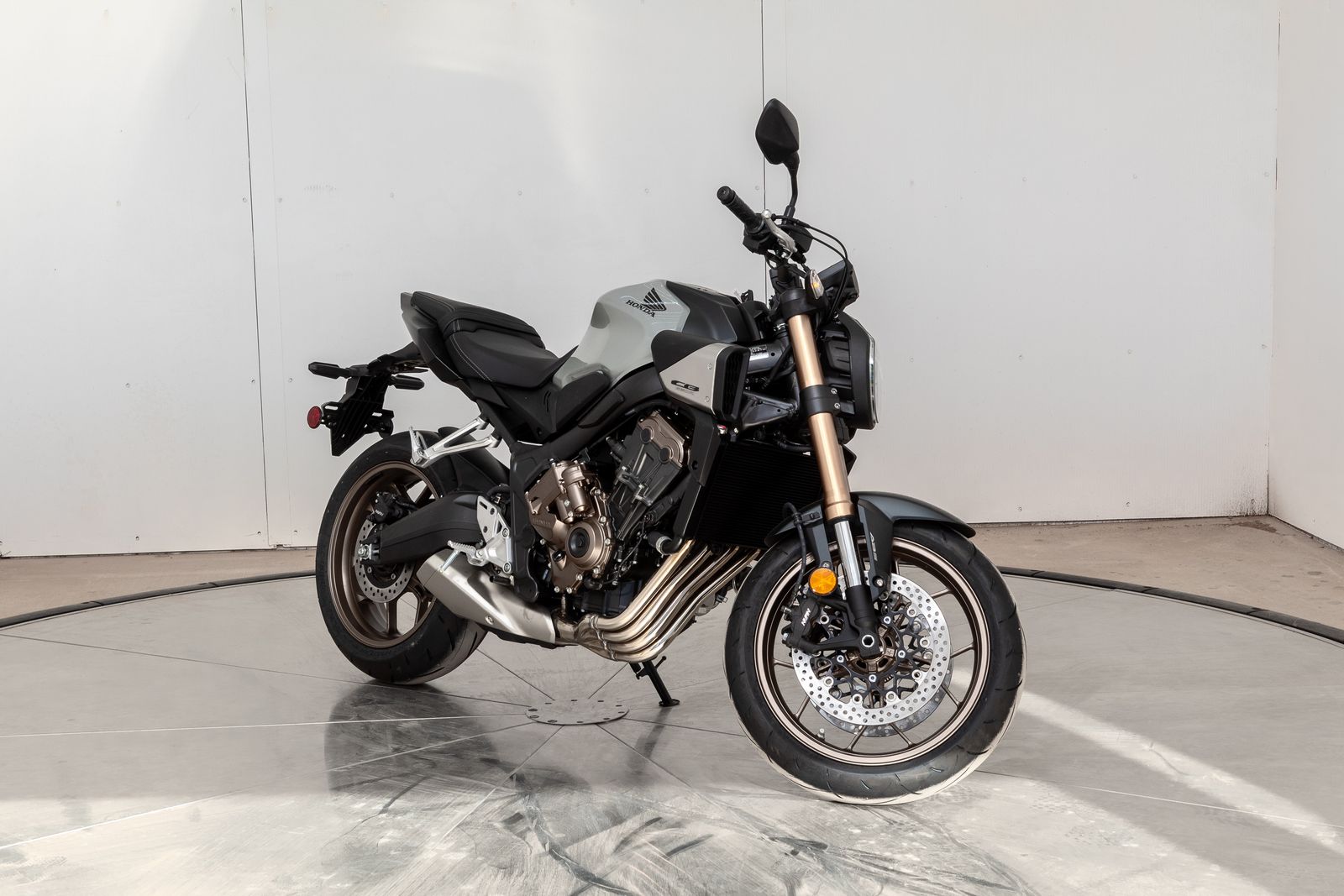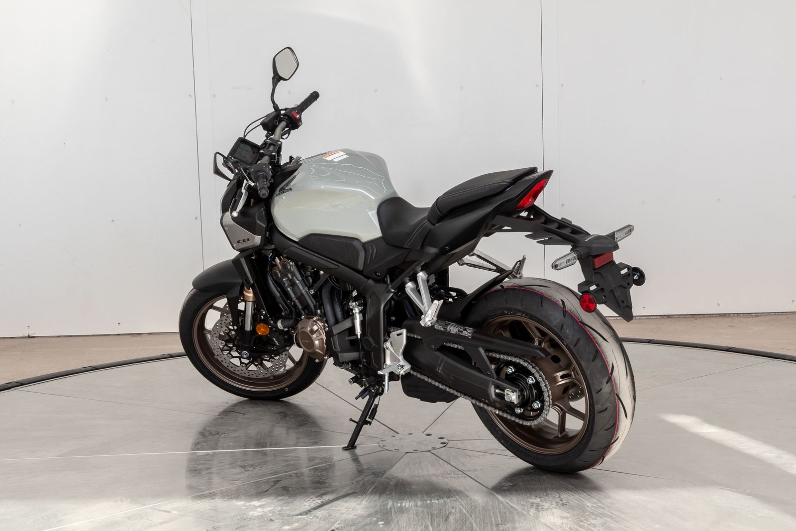 The Showa® Separate Function Front Fork Big Piston (SFF-BP) suspension ensures precision handling and smooth steering. This premium suspension system balances reduced weight with superior rigidity, making the CB650R a joy to ride on winding roads or tight urban turns.