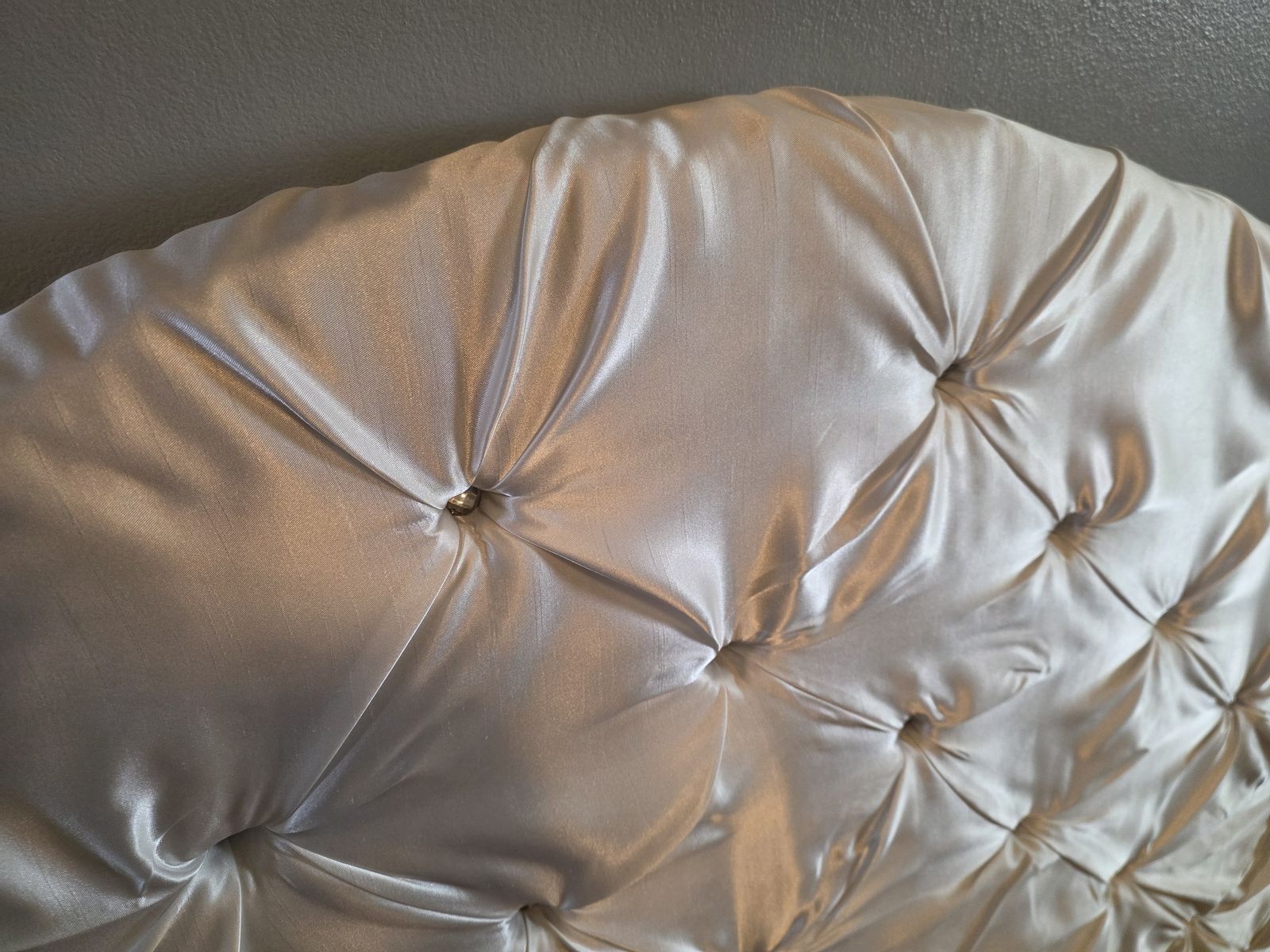 Venmo76 inches long 42 inches high. Does not need to attach to bed...meant to hang on wall. Can use for a queen or looks good with a twin/full that's parallel to wall