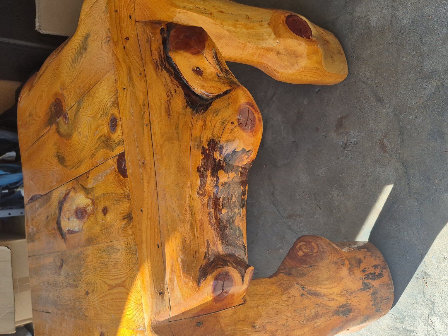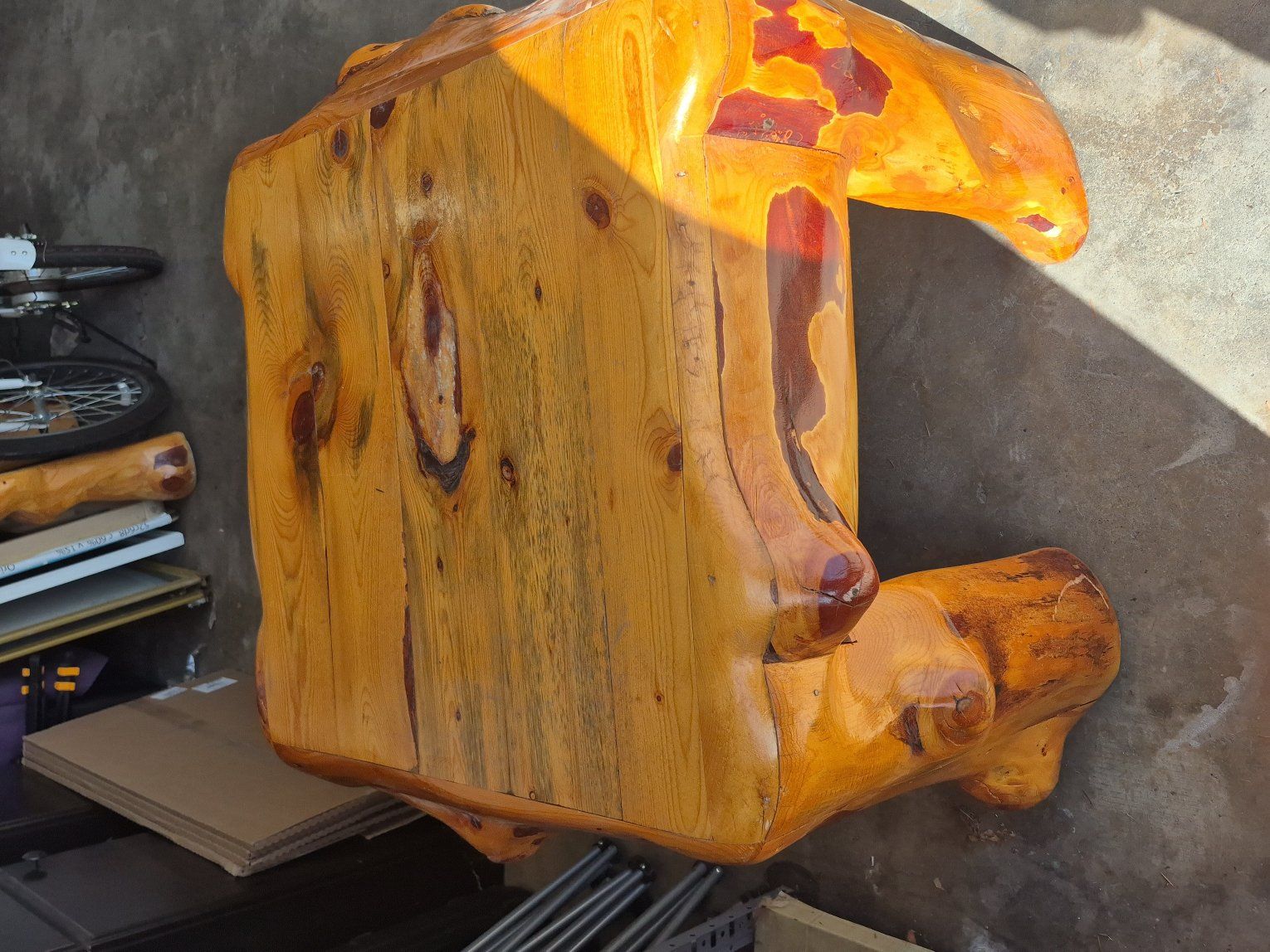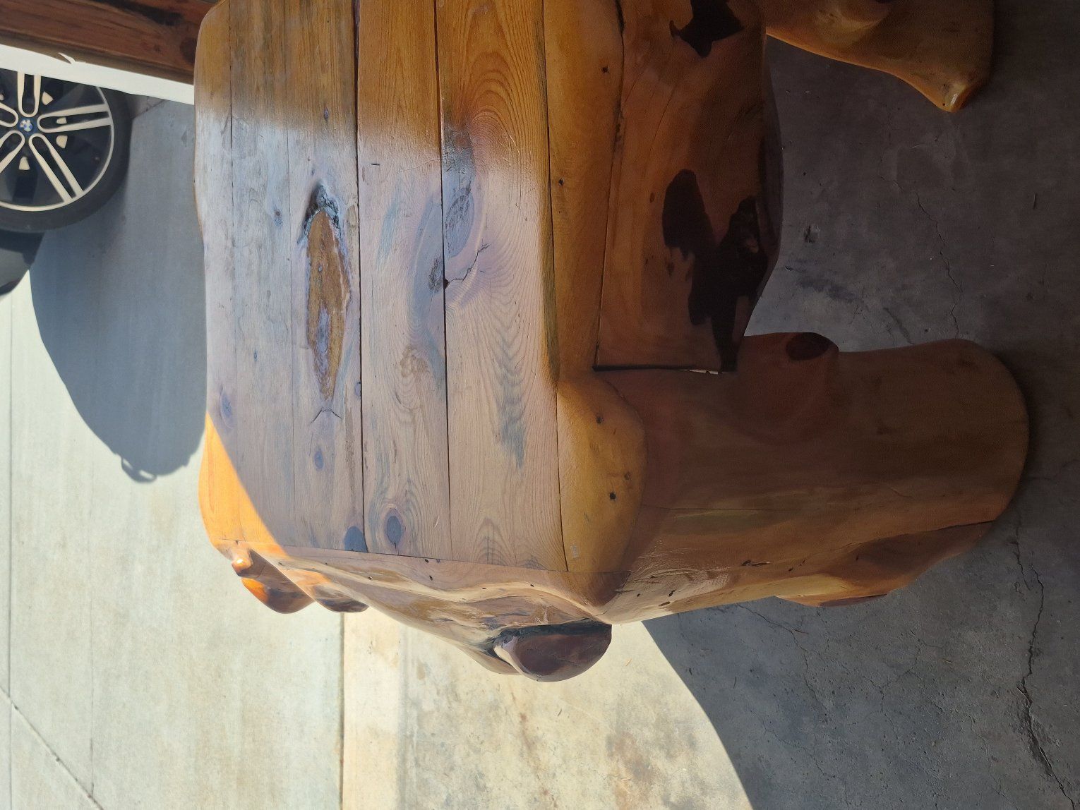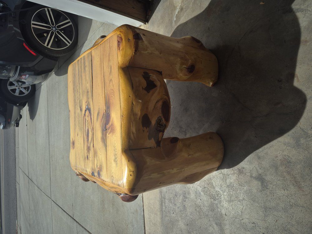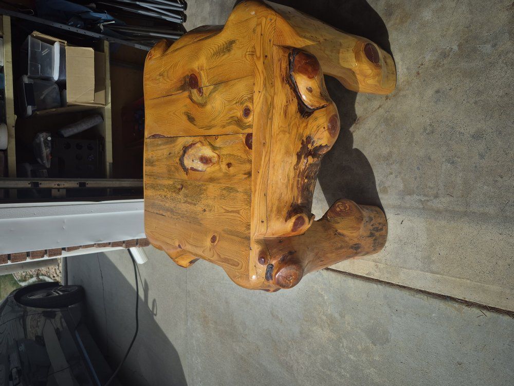 34 inches x 34 inches 24 inches tall. log pine wood. fantastic log table, also have a queen size log bed frame.
