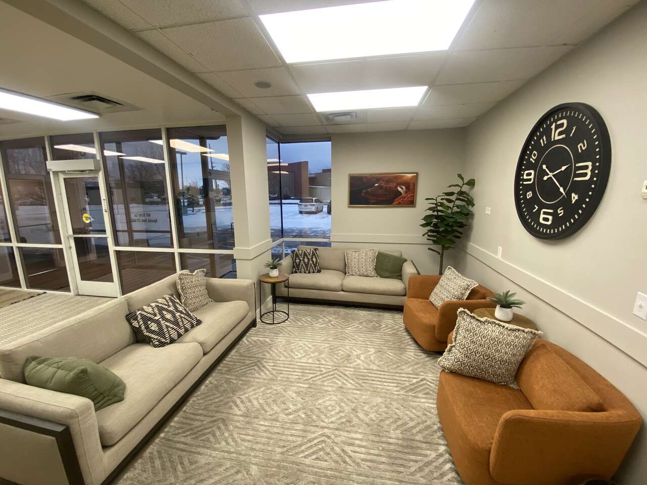 The office comes equipped with a couch, chair, desk, and office chair—creating a comfortable, professional setup so you can start seeing clients or working right away.