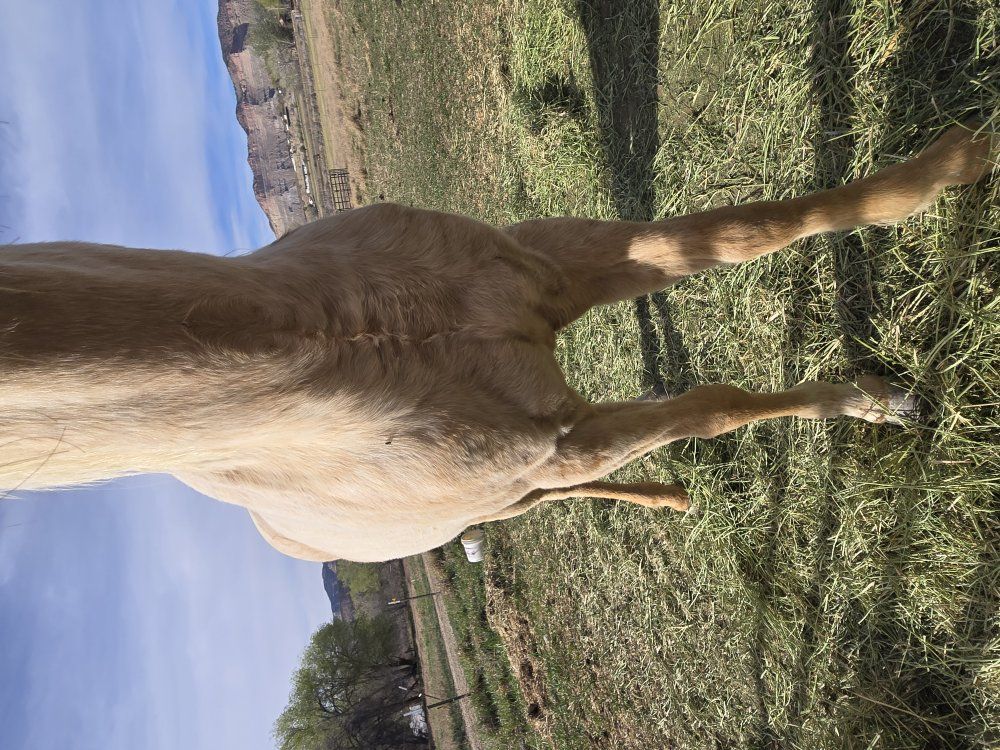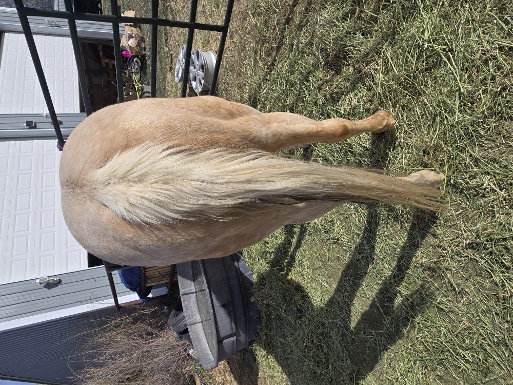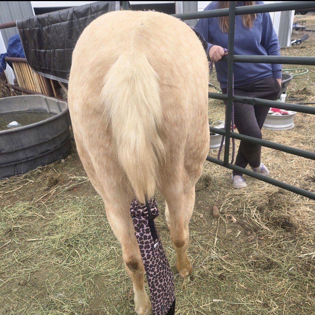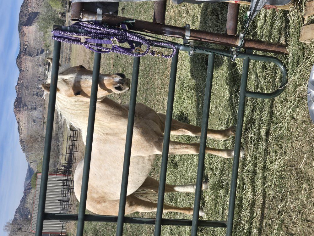 Hello, I had some things come up in life and need to sell my horse! She's not broke, but she has been started. She will be 2 in April. She is very laid back, loves treats, loves my kids, doesn't mind the dirtbike noises. Handles getting saddled very well. Still getting used to the bit a little. I have a few bales of Hay, Some grain, some sweet feed, and some treats. Will get more pictures this afternoon. Asking 3k OBO!!