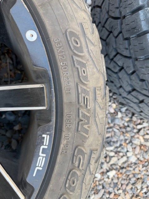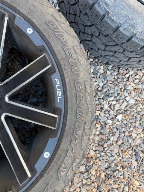 VenmoFull set of Toyo Open Country A/T III 33X12.50 R22 and Fuel Contra D616 22x12 -43. They came off my 2015 F-150. The tires has 50% life in them and the wheels have been curded and they have marks on them. $1800 OBO