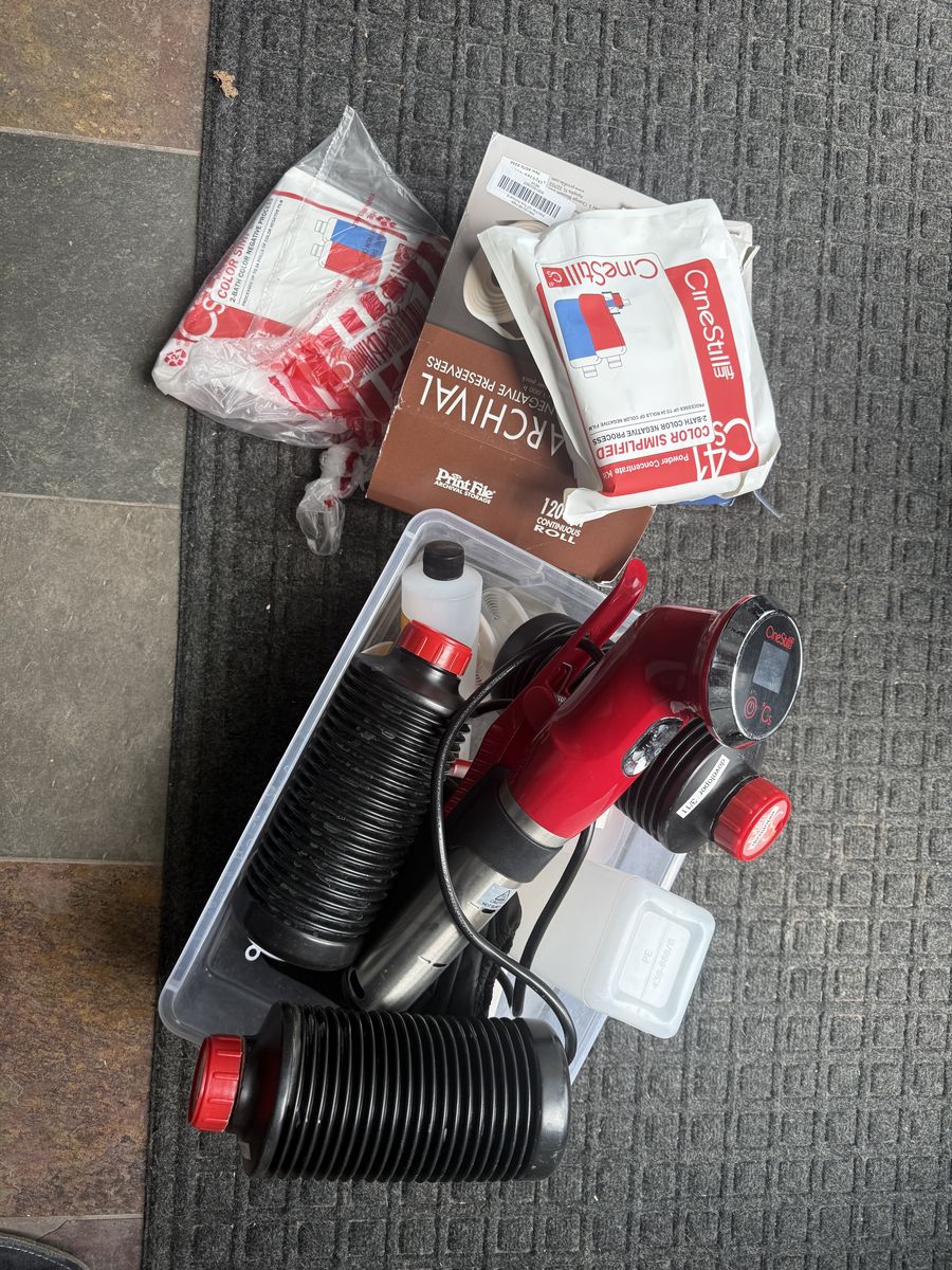 Complete home film develiping kit including patterson multi spool tank, cinestill agitator, 2 x C41 mix, storage containers, thermometers, tub for the water circ, dark bag, etc. etc. etc.