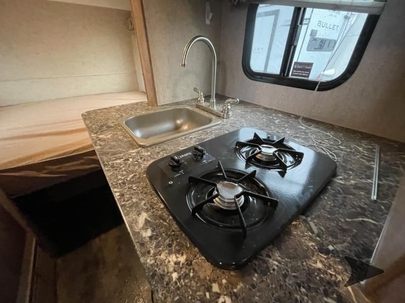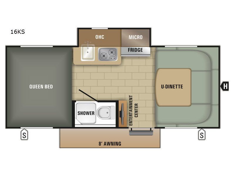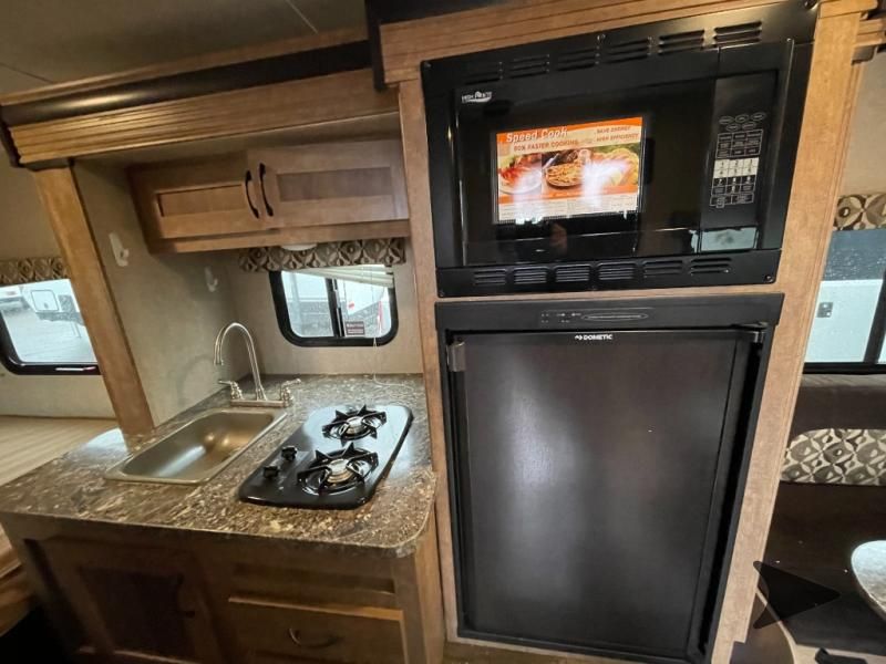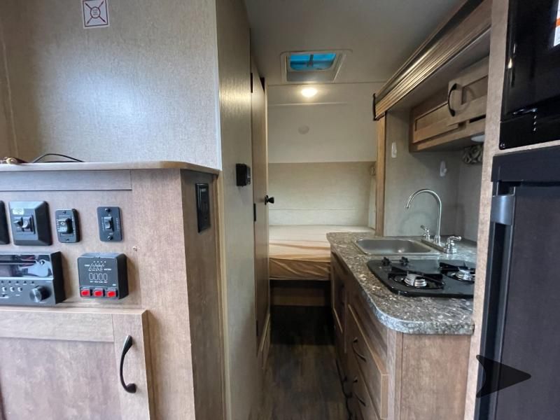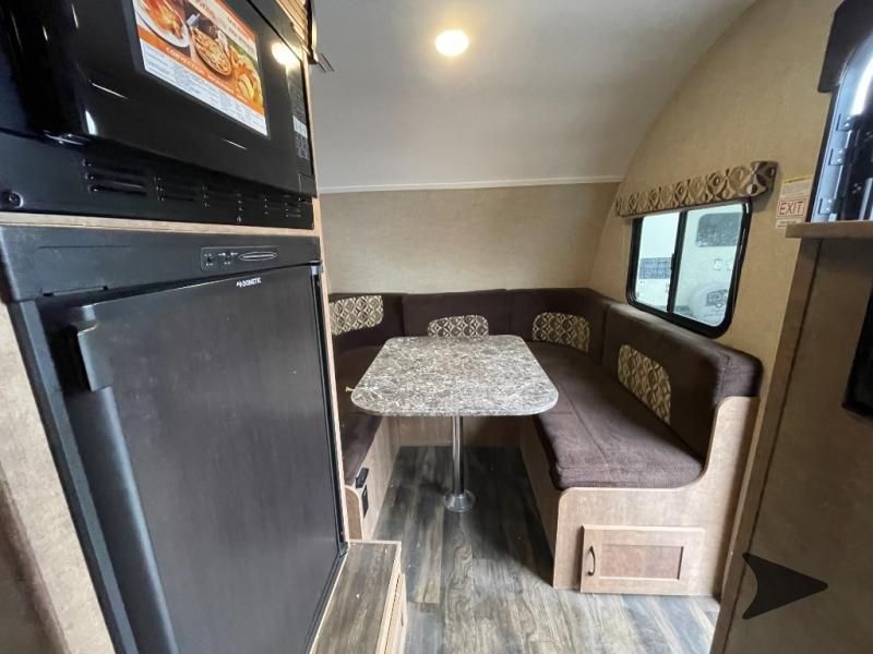 Features a comfortable sleeping area, dinette that converts for extra sleeping space, full kitchen, bathroom with shower, and plenty of storage. Compact size with a smart layout that makes camping simple and comfortable.