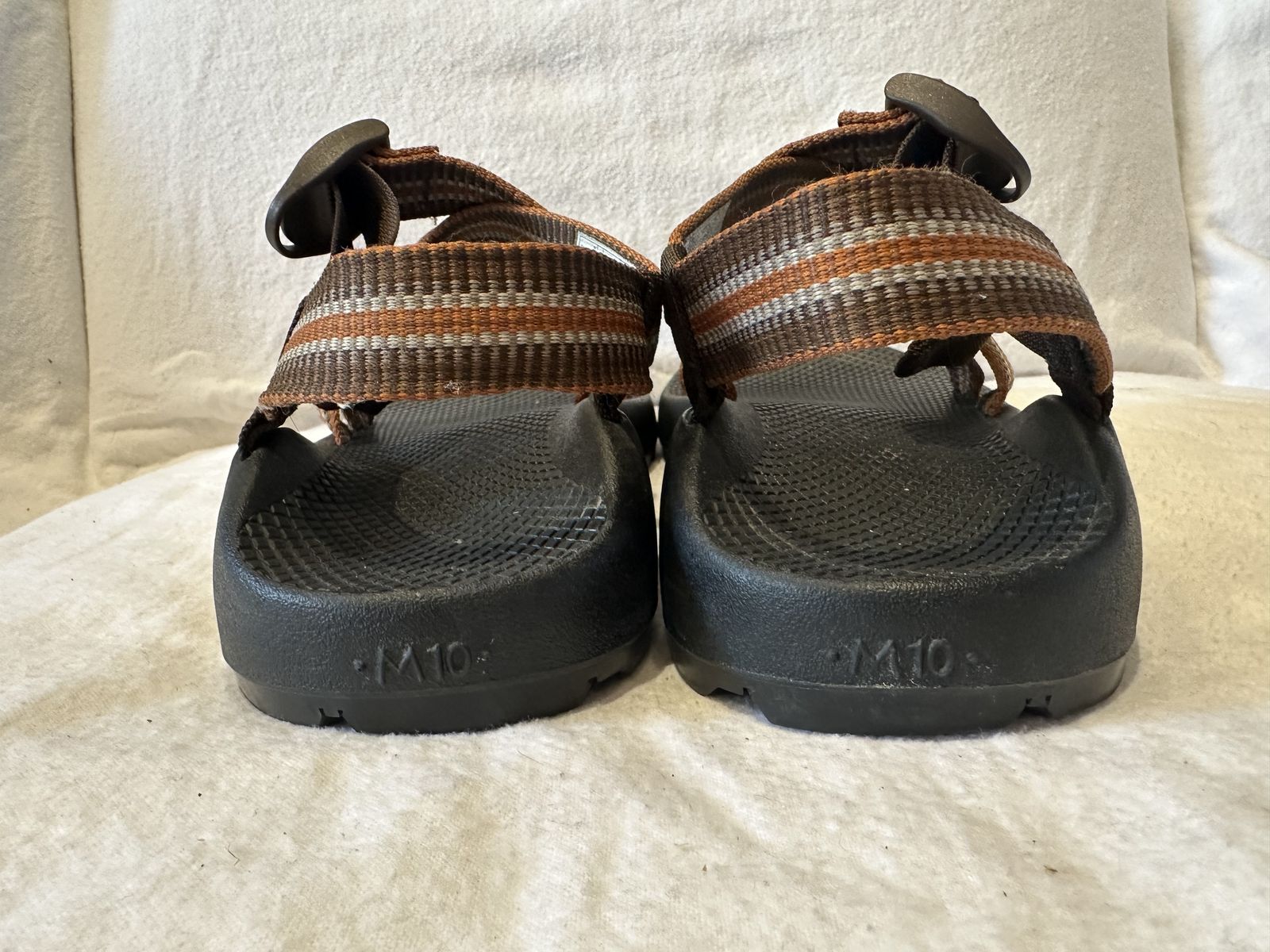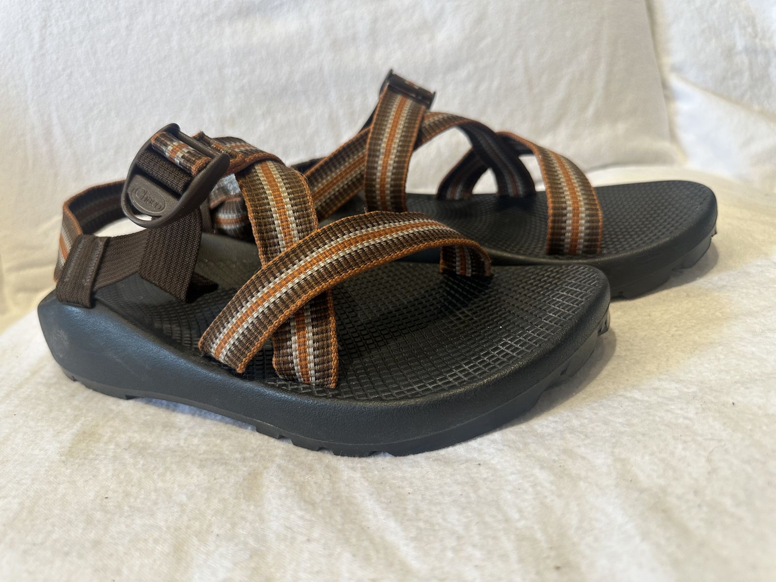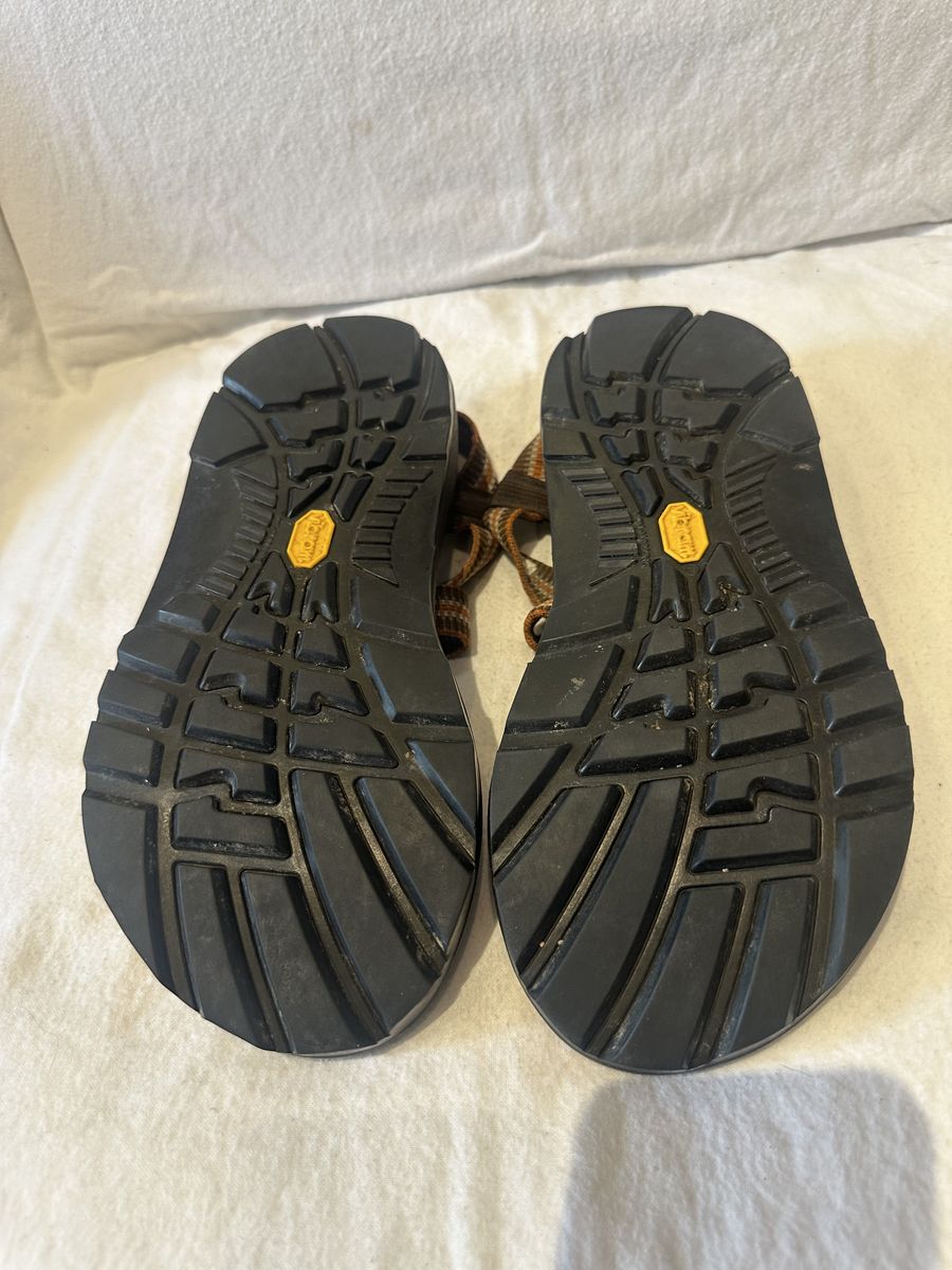 Chaco men’s size 10 brown/orange striped hiking sandals in lightly used condition. See photos for details. I take cash or Venmo, but cash is preferred. Text is best. 801-201-4446. Check out my other ads for additional sizes and styles.