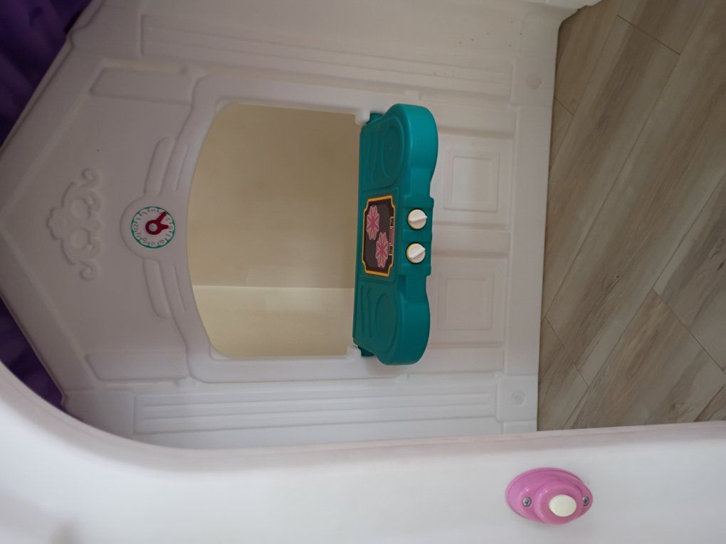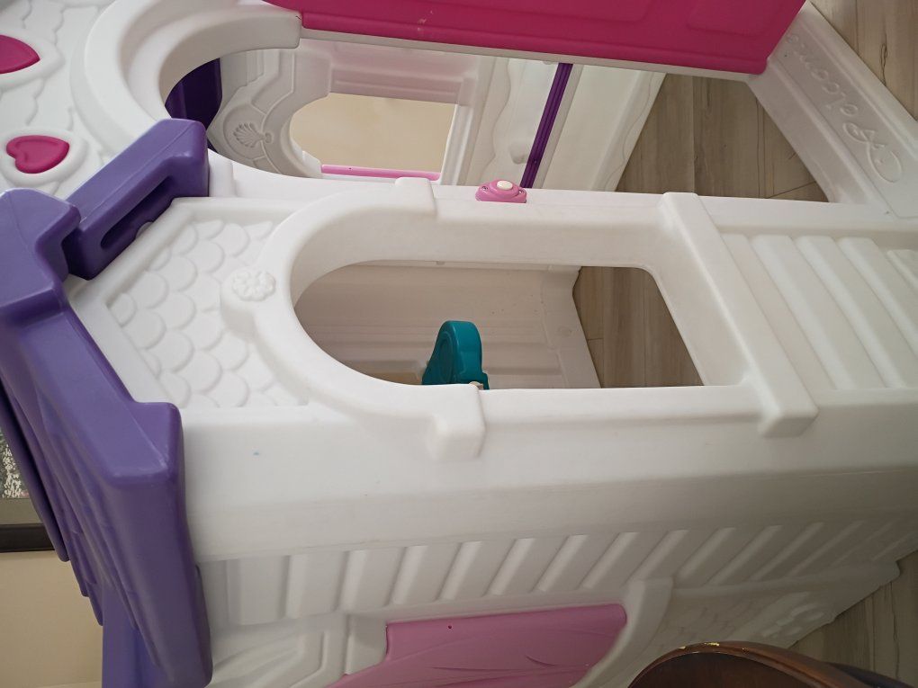 This playhouse was scored inside. Dimensios 57"H, 46"D, 51"W, 5 windows, door, this is in great shape