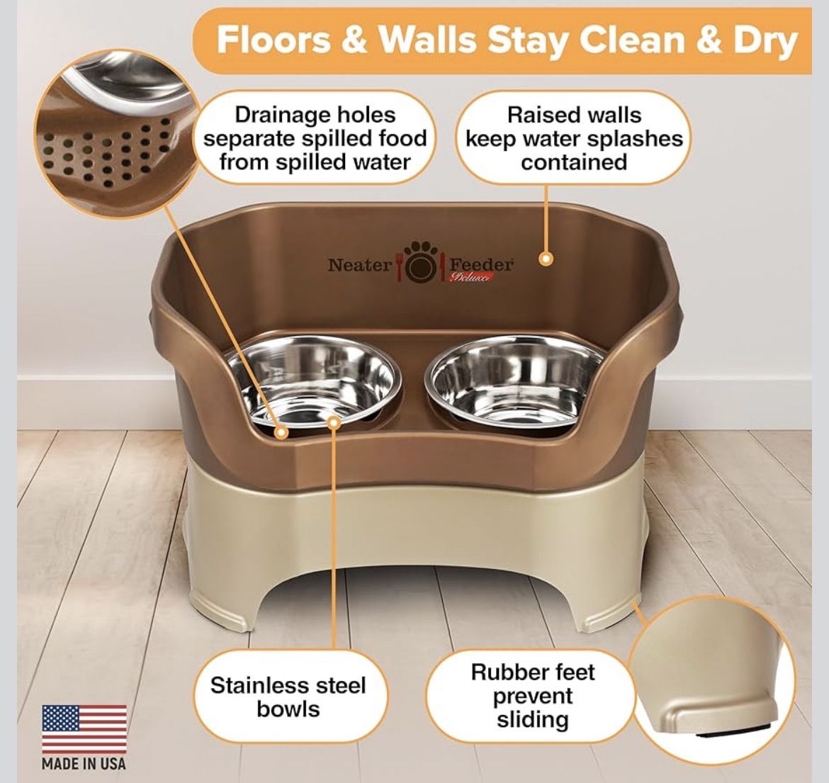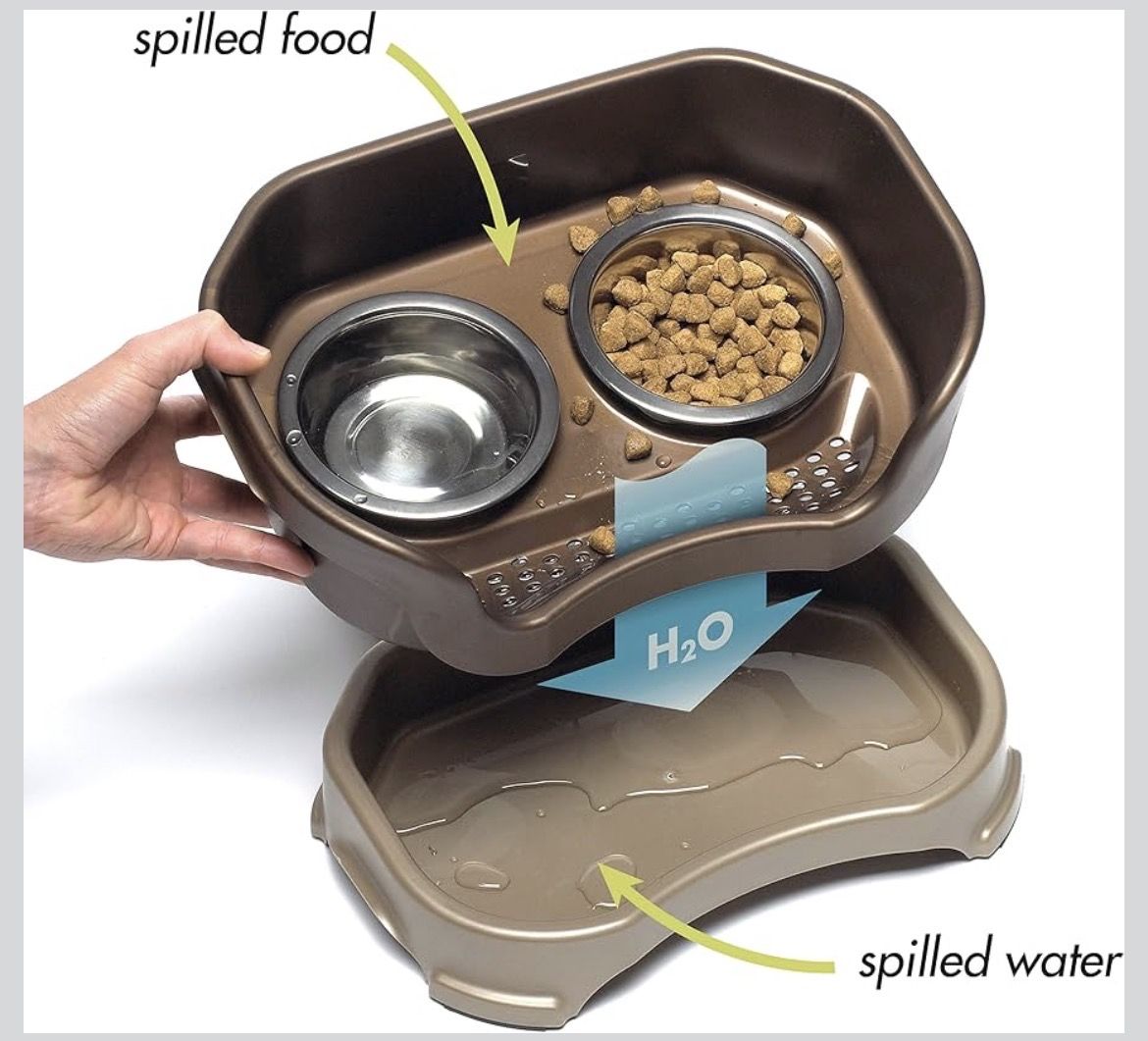 Neater Feeder Deluxe (Bronze) for medium-large dogs. Elevated for comfortable eating Stainless steel bowls included Splash guards Built-in drainage system! Keeps floors clean