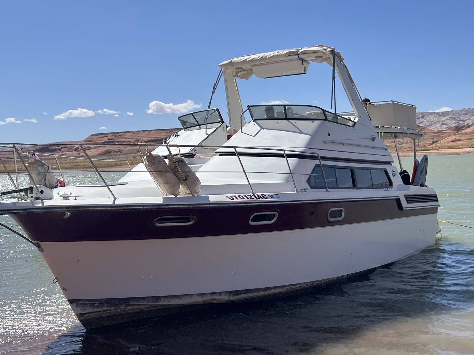 49% Share in a 1989 38’ Carver Santiago in covered slip at Bullfrog Marina, twin gas 454 power, full galley, sleeps 7 in side,gas pump for toys,condition interior 7/10 exterior 7/10 , looking for someone that has boating experience.