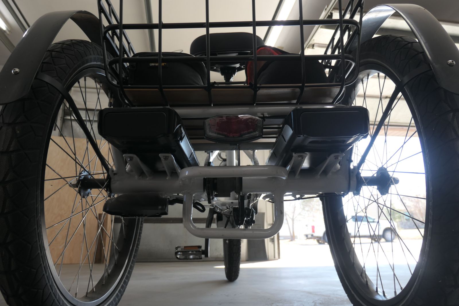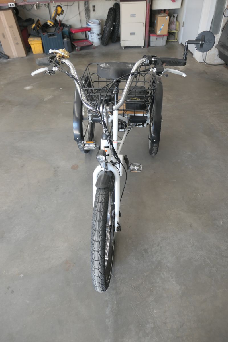 PayPalMy wife and I looked in AZ and UT trying to find a well built Etrike for her with disk brakes and Shimano gearset. Every trike we looked at felt flimsy and was driven by one rear wheel. Then we found the Evelo. It is super sturdy, offers 3-speed Shimano shifting from the right handgrip and has a unique differential that allows either wheel to drive, unaffected by cornering. And, it had Tek Pro disk brakes both front and rear that easily stops the 2.4" x 24" tires. Wheels are laced with heavy duty 13-gauge spokes. A 500W Bafang BBS02 Mid-Drive Brushless Motor w/ 105Nm of torque assists you through five selectable levels. Or, you can peddle it conventionally with no assist. A rear view mirror is attached to the left handgrip. The assist will allow you to peddle up to 20 mph, but this maximum is selectable in the settings menu. This is a Class 2 Etrike, which means there is a lever on the left handgrip that allows you to ride without pedaling. Just push the lever down to go and the spring return safely brings you back to zero. We added the second 500W battery so the range is now extended to near 100 mi, depending on your level of assist, your weight and the type of terrain your riding in. The Evelo 3.2" color display is large and easily read. The selections for speed, distance, calories expended, etc, are easily selected with your left thumb. We added a Cane Creek Thudbuster seatpost with a Seafas wide, comfort seat. Or you can install the OEM, narrower seat, included. The 20" x 15" x 10" basket hauls plenty of stuff. We mounted two Riggs pouches for some minimal tools and small items. If you are considering an Etrike, but want a sturdy, well-designed trike that will most likely outlast you, this one is absolutely just like new. The odometer shows 549 mi. Unfortunately, an unexpected medical condition has forced my wife to abandon her riding, so the trike is now for sale. We paid over $4,000 new for it.