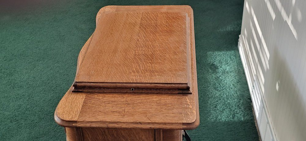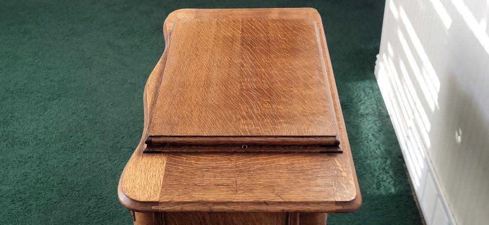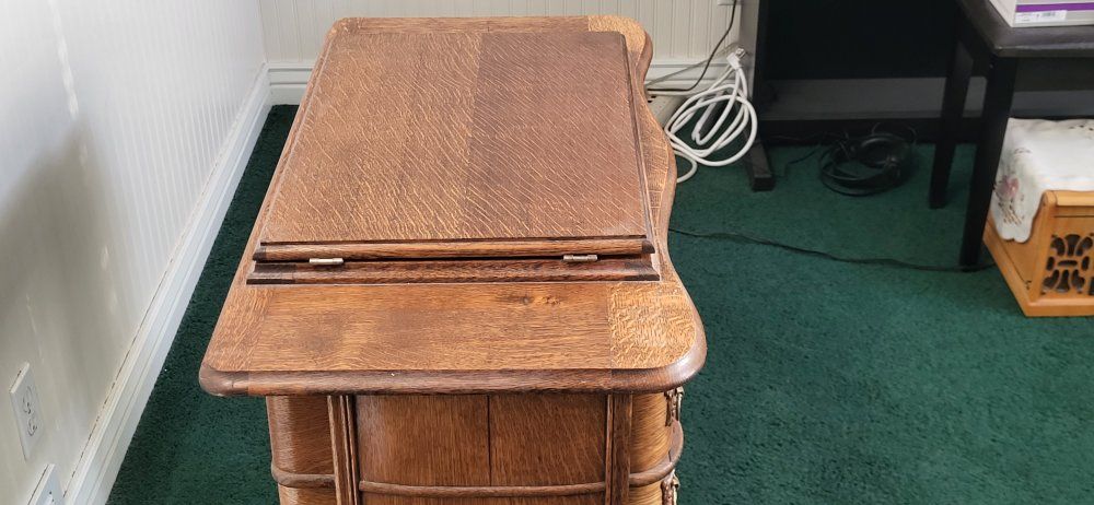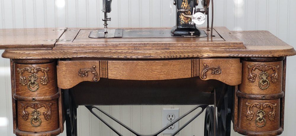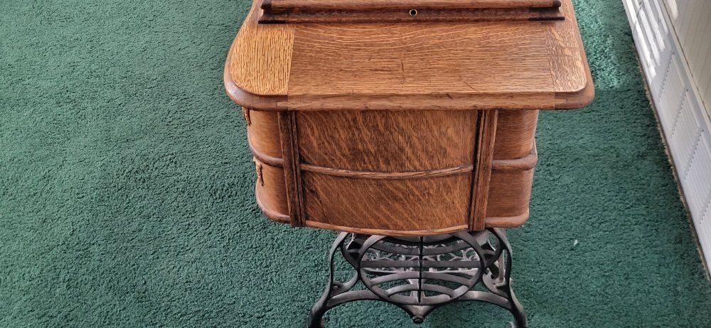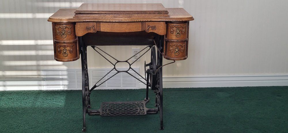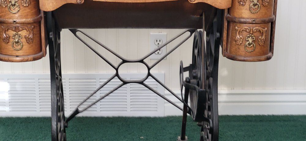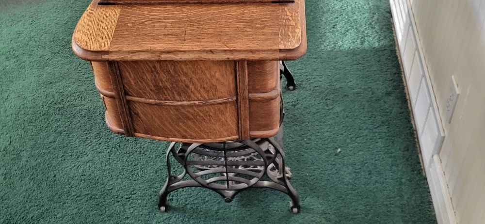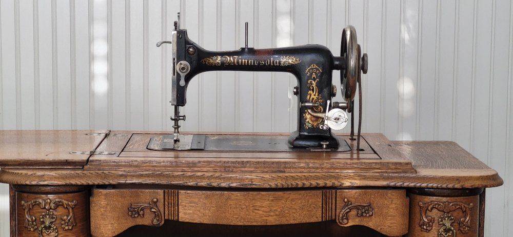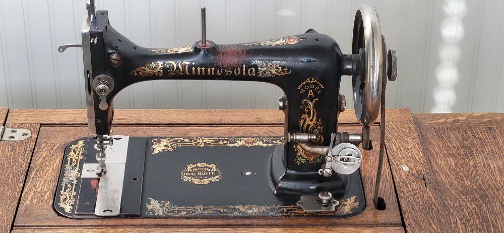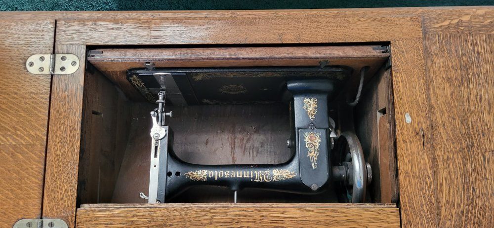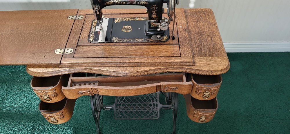 This is a nice show piece non-working Minnesota brand sewing machine in a presentable cabinet.