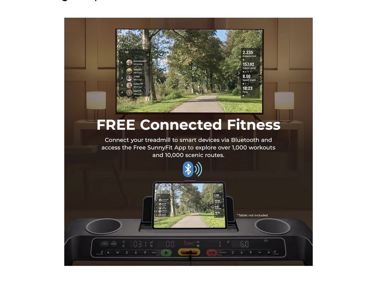 Free SunnyFit app unlocks thousands of on-demand guided workouts and over 10,000 scenic virtual routes streamed directly to your device via Bluetooth for a motivating, immersive fitness experience
