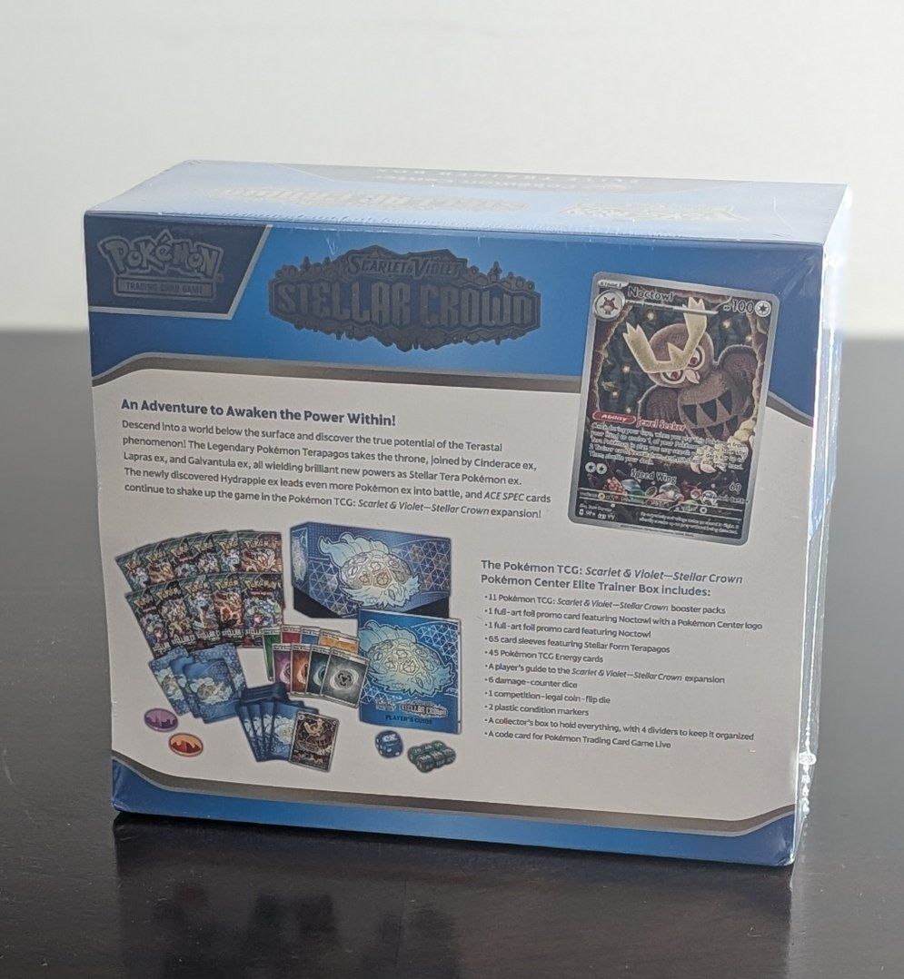 Includes: 11 Pokémon TCG: Scarlet & Violet—Stellar Crown booster packs Each booster pack contains 10 cards and 1 Basic Energy. Cards vary by pack. 1 full-art foil promo card featuring Noctowl with a Pokémon Center logo 1 full-art foil promo card featuring Noctowl 65 card sleeves featuring Stellar Form Terapagos 45 Pokémon TCG Energy cards A player’s guide to the Scarlet & Violet—Stellar Crown expansion 6 damage-counter dice 1 competition-legal coin-flip die 2 plastic condition markers A box to hold everything, with 4 dividers to keep it organized A code card for Pokémon Trading Card Game Live
