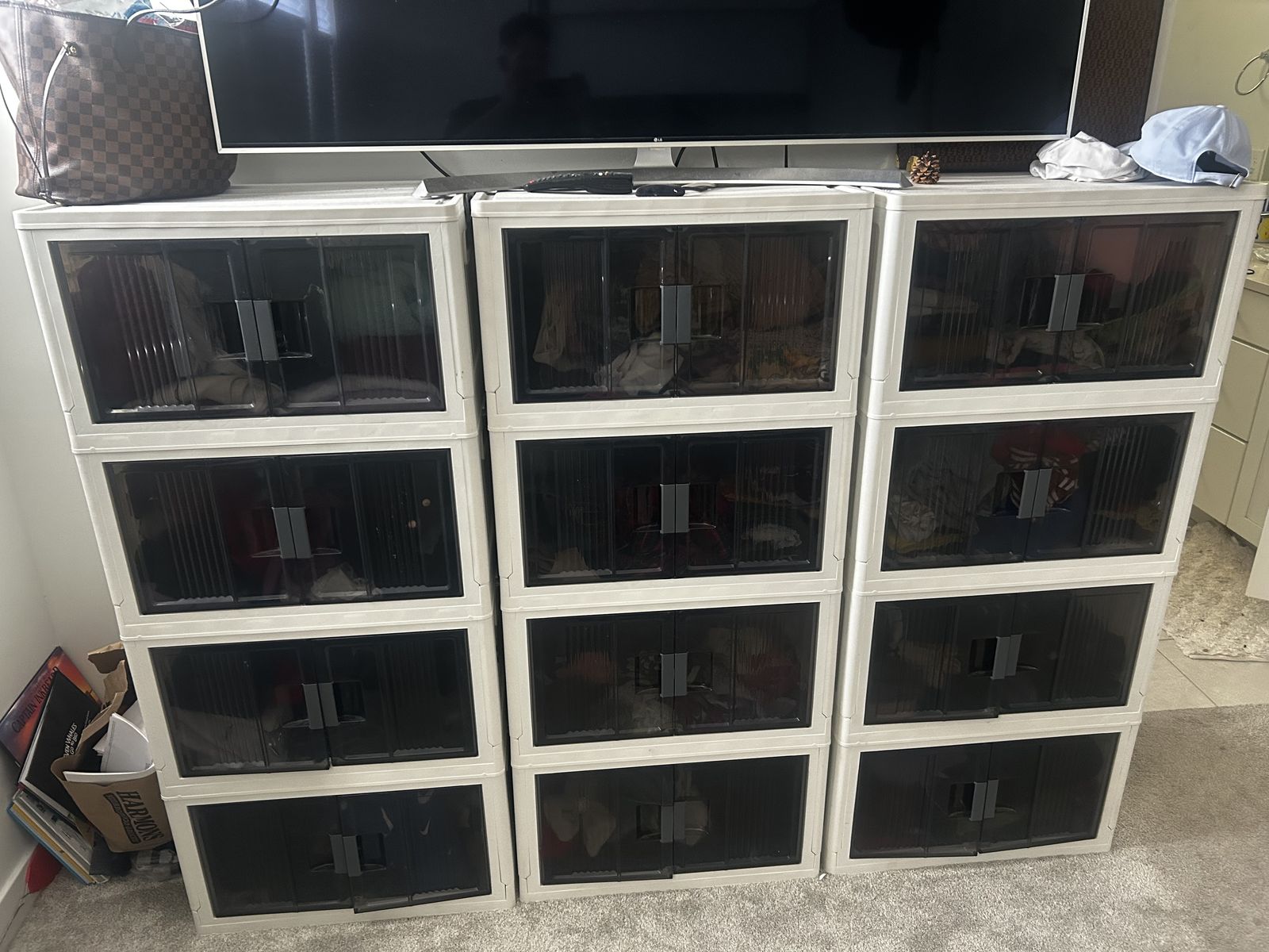 Selling a full set of modular shoe storage organizers. Includes 22+ individual cube units with tinted front-opening doors—perfect for keeping shoes , clothes , anything clean, organized, and easy to see.