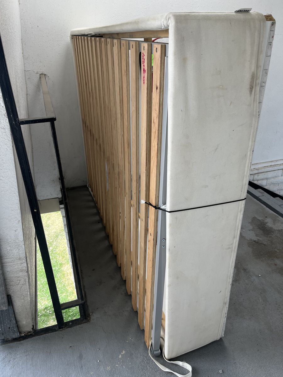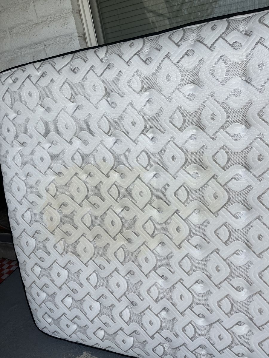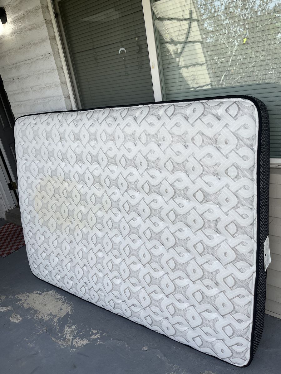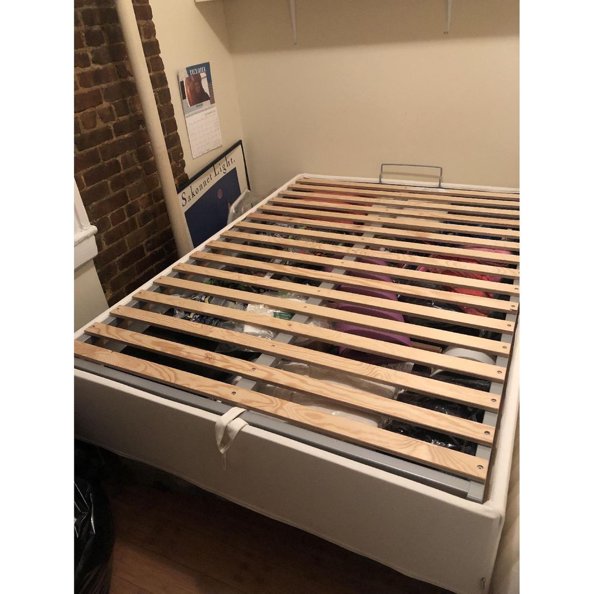 ApplePayBed frame with storage! Mattress lifts up like a clam shell to reveal some awesome storage space! Bed frame fabric skirt has some discoloration but can easily be removed and washed. Mattress is only a few years old and was only slept on for about 2.5 years and been sitting ever since.