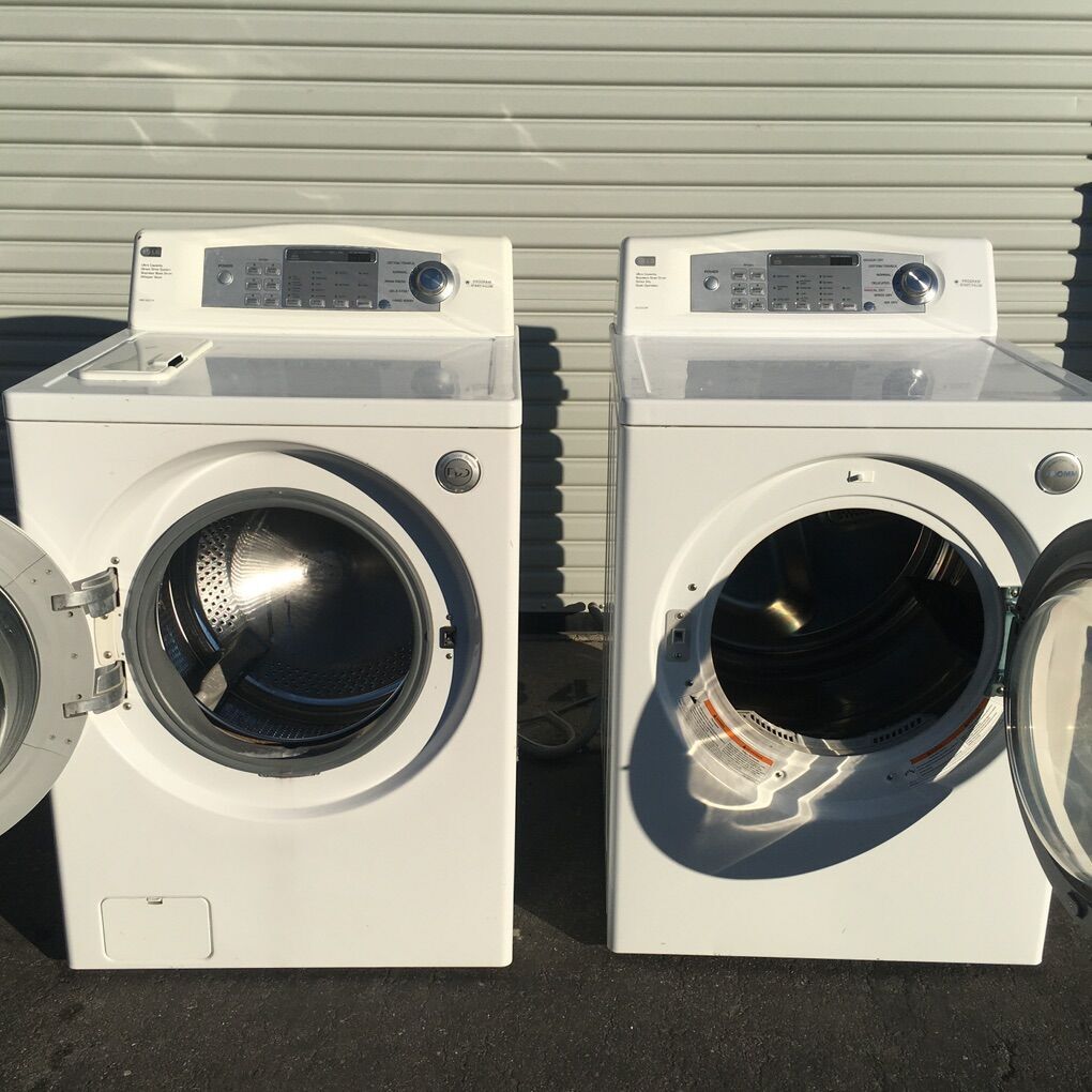 Clean Realiable Hi Capacity Hi Efficiency Washer and Electric dryer combo in Great mechanical and Great cosmetic condition. Has DeWrinkle, speed wash, speed dry and also washes bulky loads. Proffessionally inspected, serviced and sanitized after one owners usage. 4.5 Cu Ft Washer. 7.4 Cu Ft Dryer. 27 W 26 D 42 H. Free delivery within 15 miles, comes with all necessary attachments and warranty.