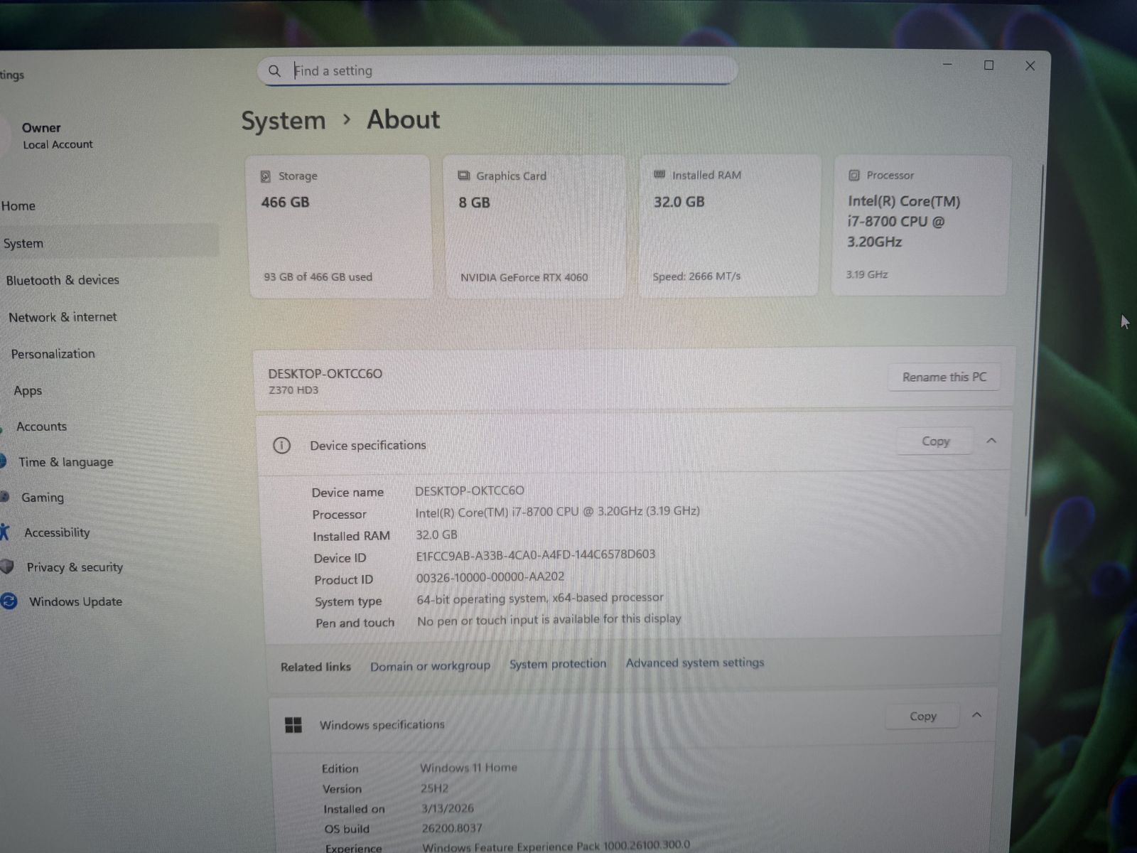 8th Gen Intel Core i7-8700 CPU @ 3.20GHz