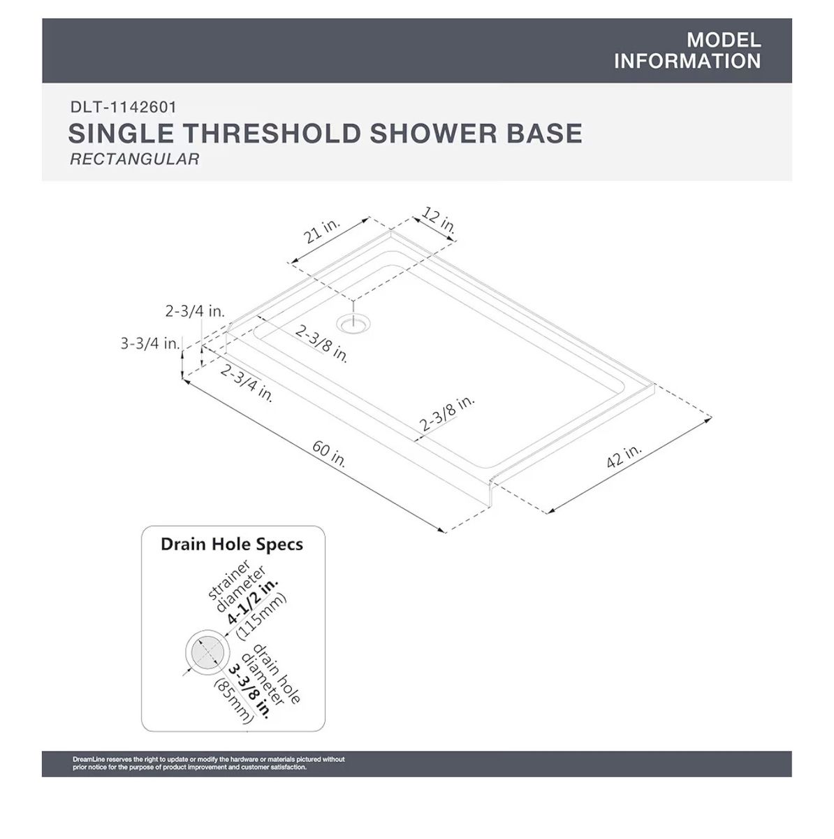 Model Size: 42 in. D x 60 in. W x 2 3/4 in. H; Base Type: Single Threshold (3-Wall Alcove); Color: White