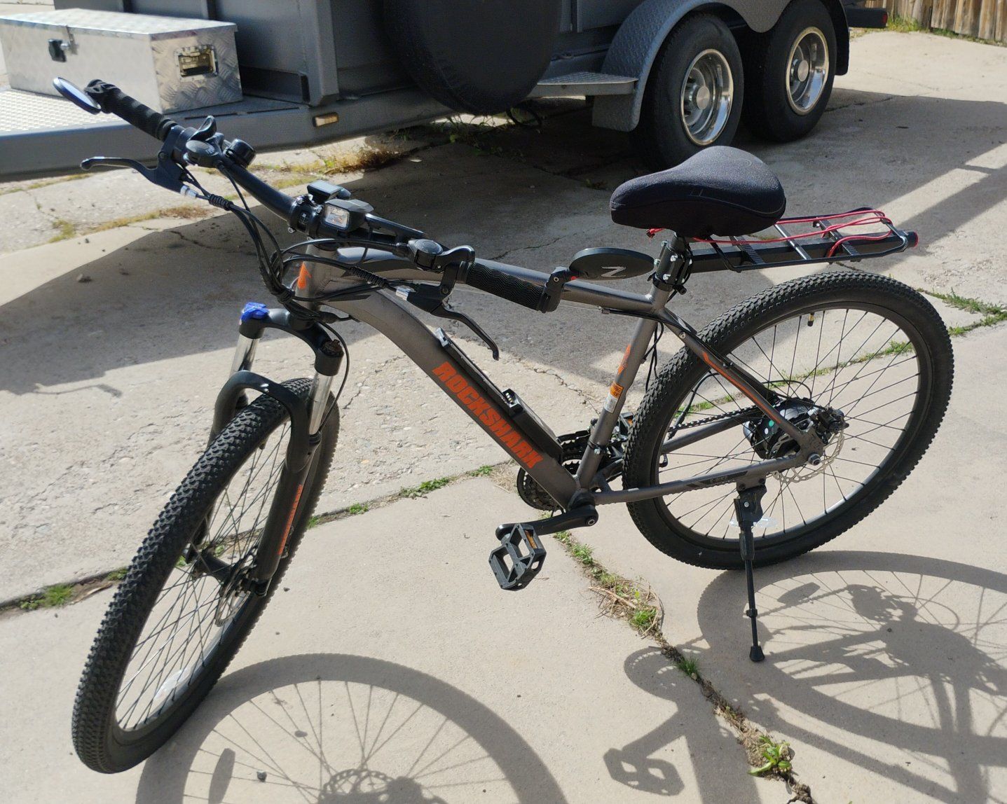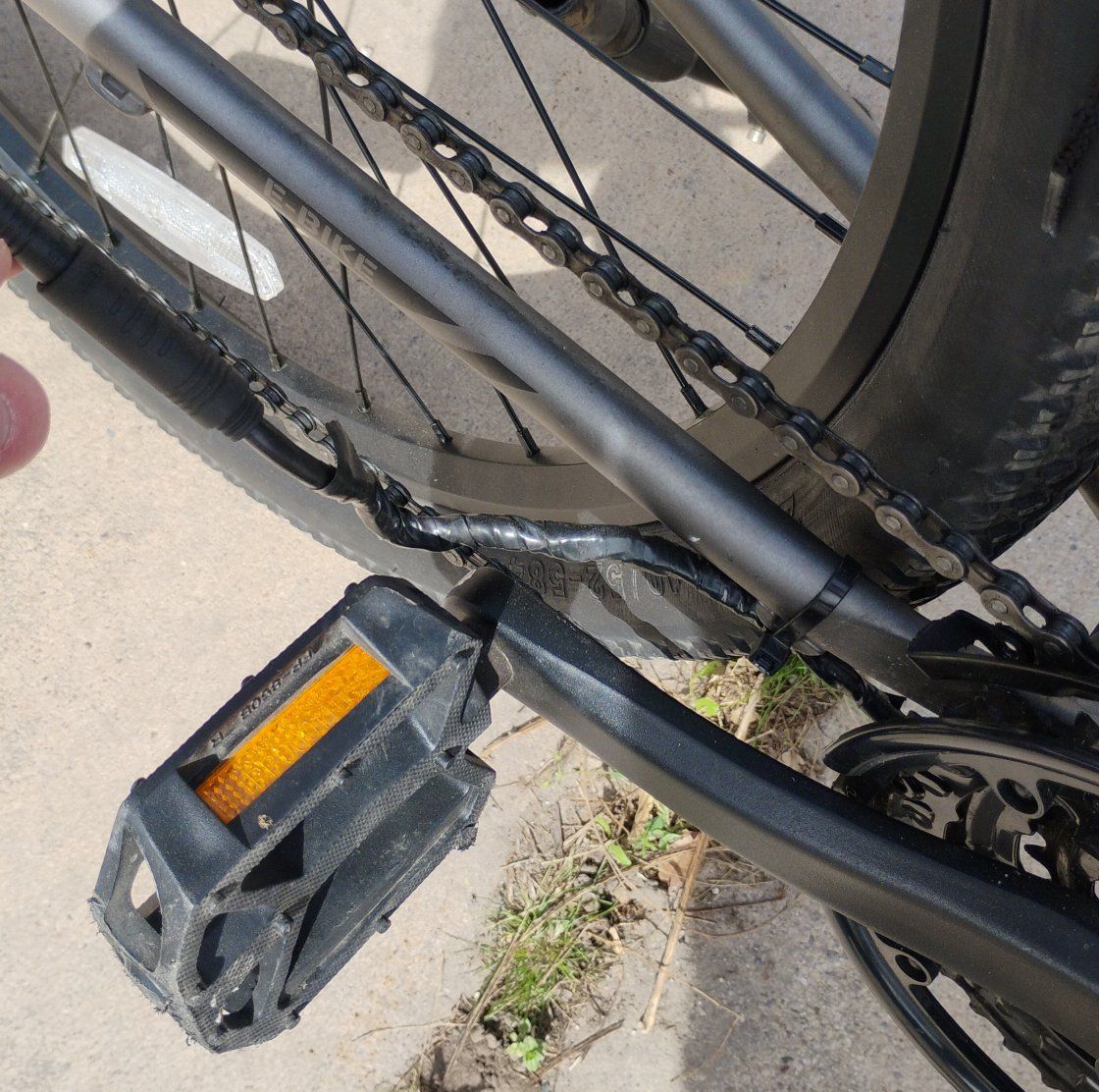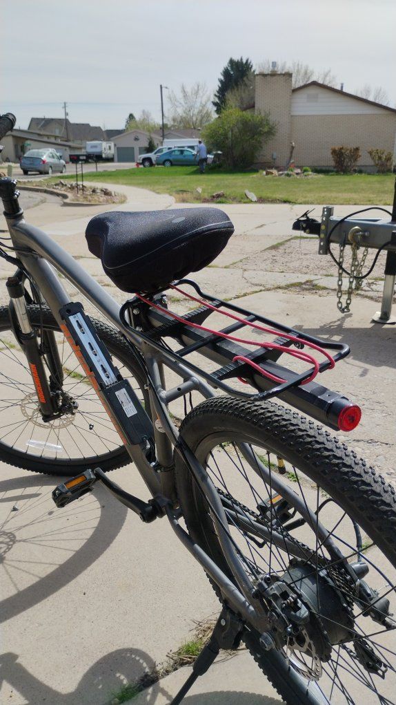 It has a broken electric motor and damaged wiring from riding, but otherwise in good condition. Comes with cargo rack an electronic speedometer and a seat cushion. Only use as a normal mountain bike unless you wish to fix or replace motor.